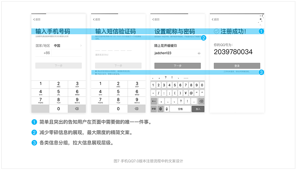 手機QQ在7.0版本的注冊Redesign中,首先分析頁面信息優(yōu)先級,將頁面信息按權(quán)重排序,依次為核心步驟層、內(nèi)容輸入層、輔助信息層,還有包含可點擊交互操作的操作引導(dǎo)層。然后通過字號、字色與字重拉開信息層級間的差距,最終將用戶聚焦到核心信息上來。
