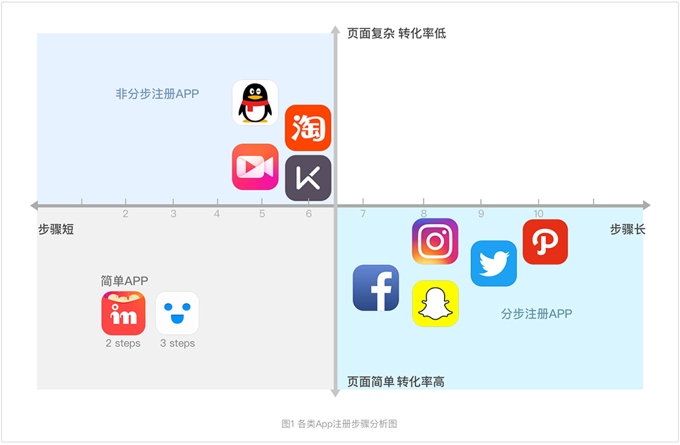 依據(jù)桌面調(diào)研,多數(shù)分步注冊APP平均為5步左右,多數(shù)非分步注冊APP平均為8步左右。并且Facebook曾針對分步注冊與非分步注冊做過A/B Test,其結(jié)論指出分步注冊的轉(zhuǎn)化率遠高于非分步注冊。由此可見,非分步注冊強行減少注冊頁面,不如適當拉長戰(zhàn)線,給用戶輕負荷的操作,讓用戶在不知不覺中完成注冊流程。