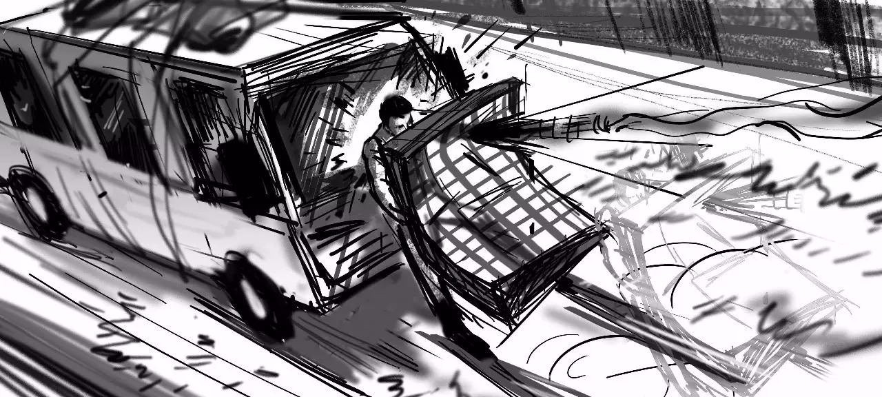 Sam按照美國(guó)電影工業(yè)的習(xí)慣,沒(méi)有文字分鏡給我們,只有英文翻譯成中文的:車(chē)的走向,人的動(dòng)作,這些很片段化的東西,更不會(huì)限制你設(shè)計(jì)機(jī)位,限制你繪制多少顆鏡頭表現(xiàn)一個(gè)冷鋒的動(dòng)作,一個(gè)汽車(chē)甩尾,一個(gè)爆炸,一個(gè)撞擊。