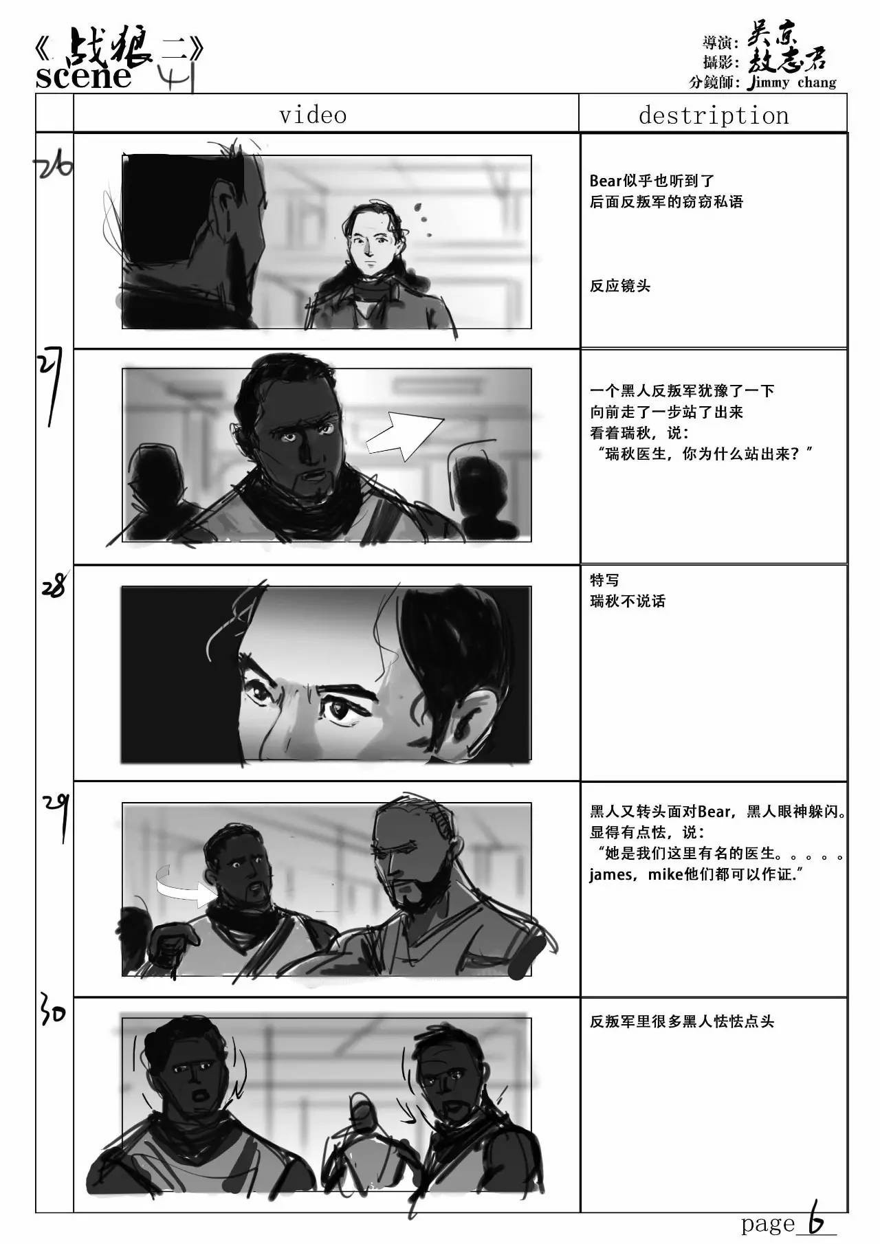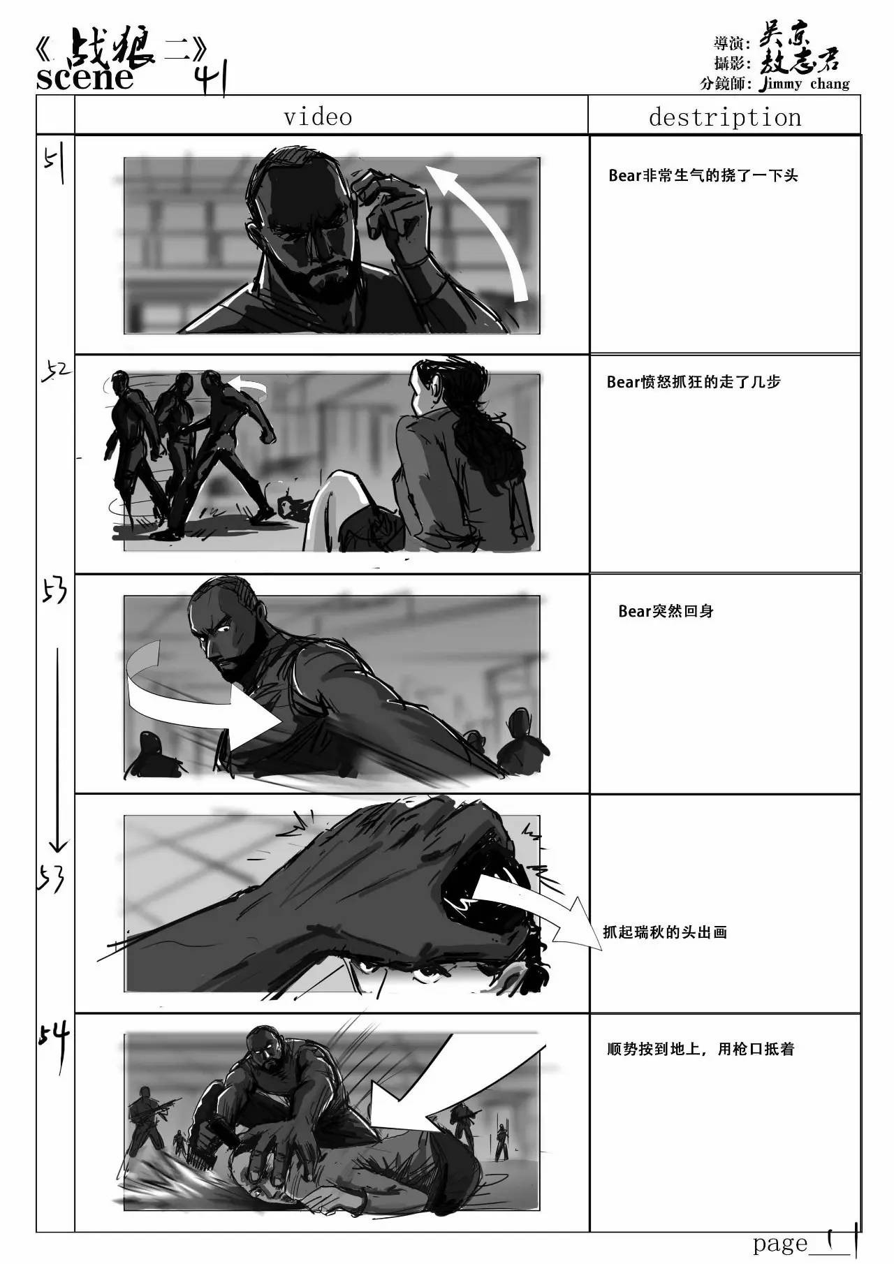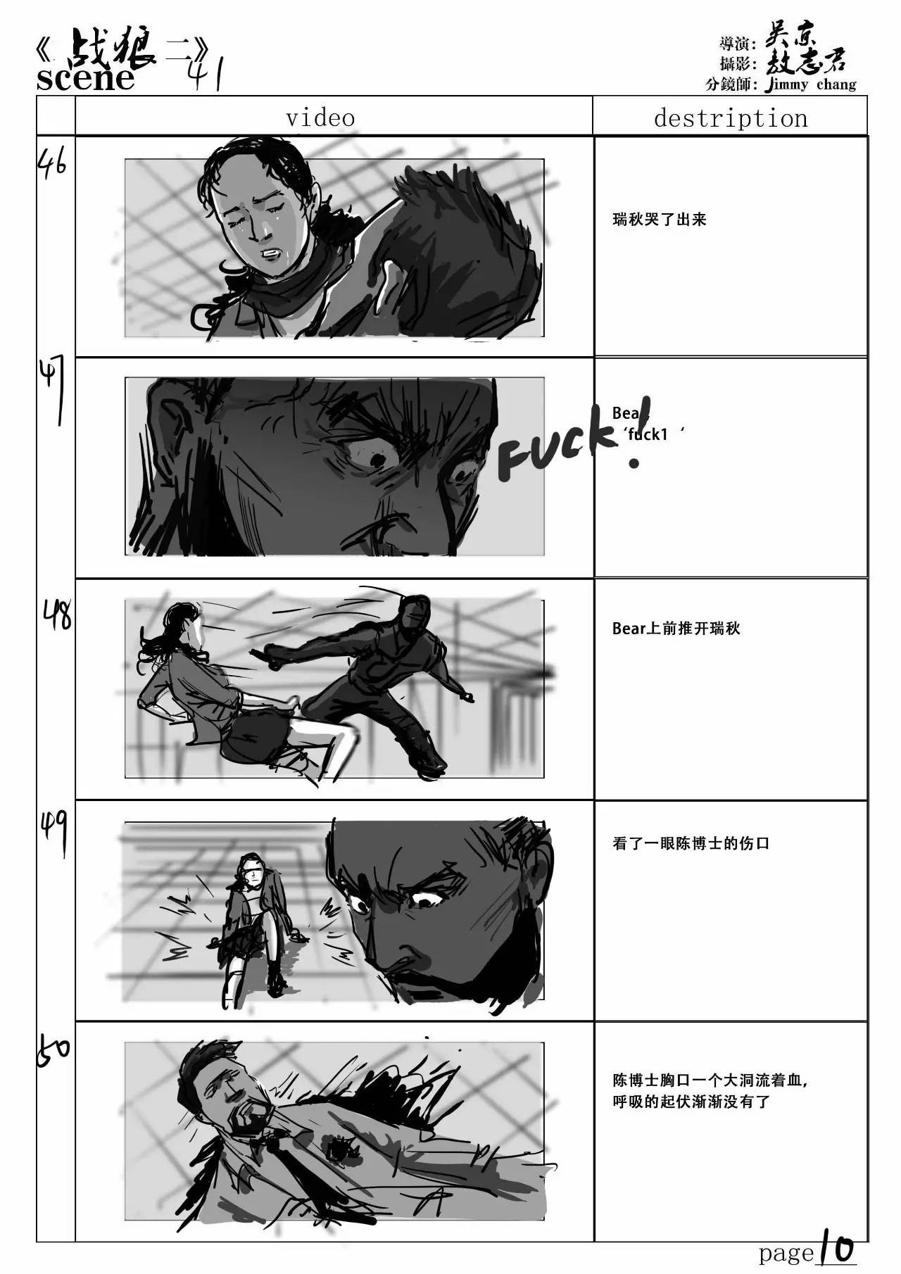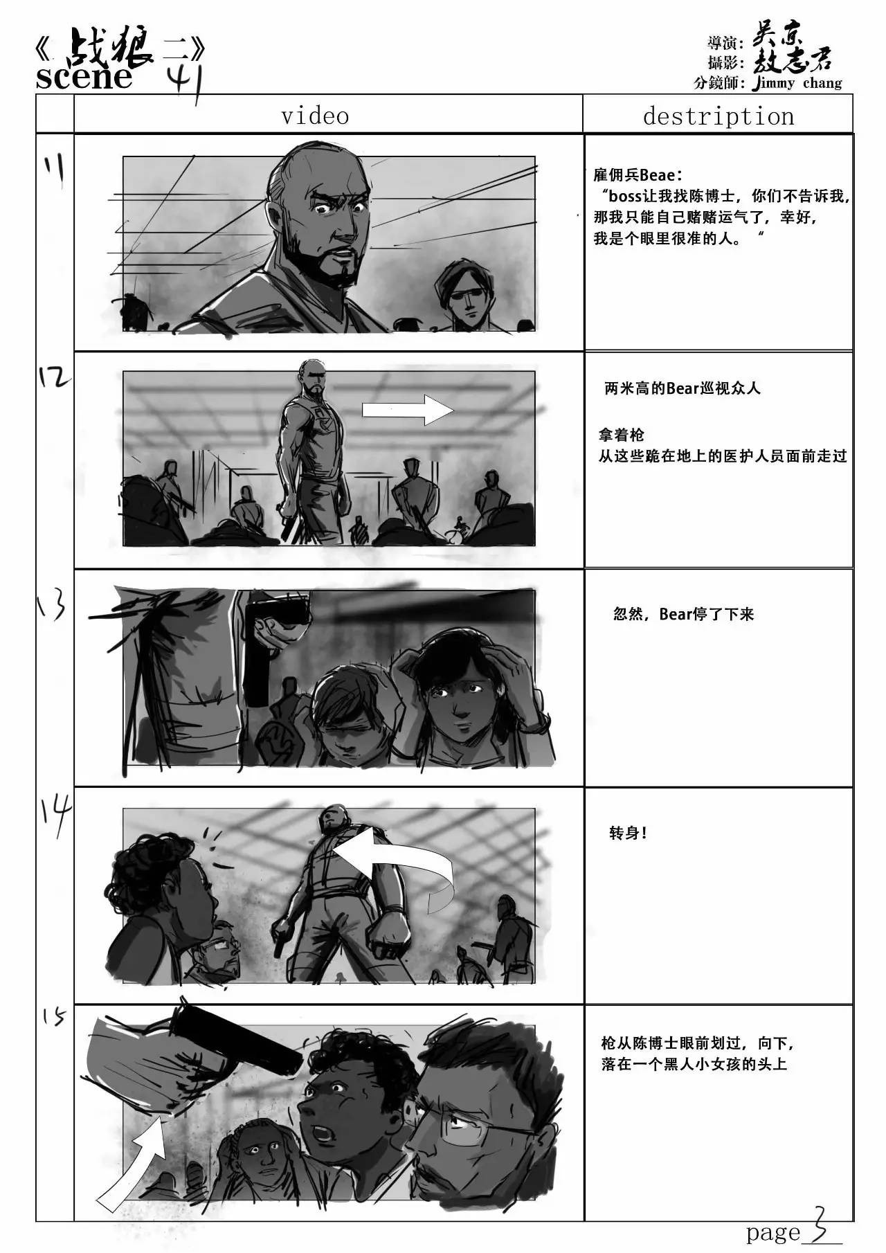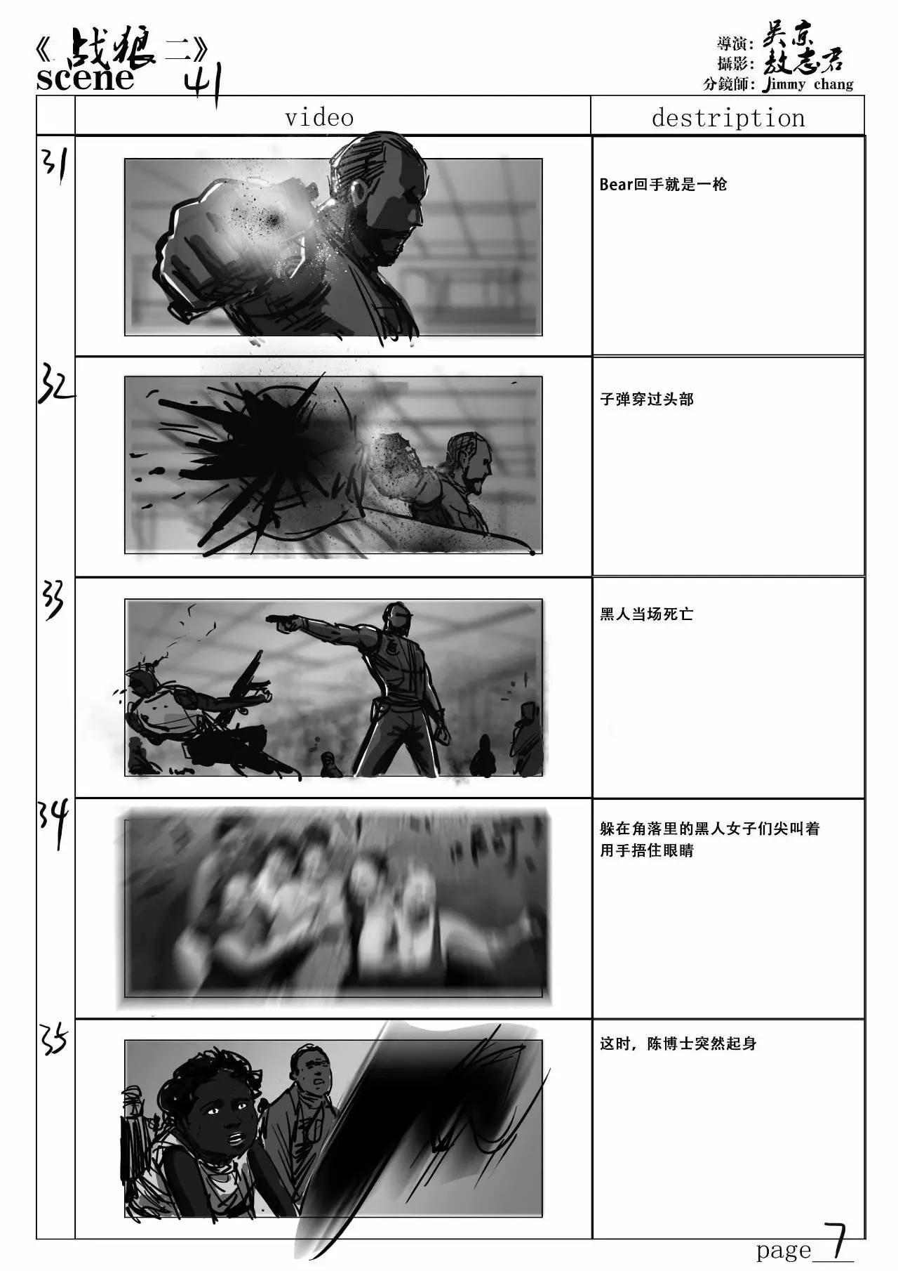 wuhu君:說(shuō)到《戰(zhàn)狼2》的故事板,兄弟為這部電影繪制了好多分鏡,而且場(chǎng)面沖擊力和視覺(jué)感都很棒,可以分享一下兄弟對(duì)哪一場(chǎng)戲印象最深刻嗎?創(chuàng)作分鏡是一個(gè)怎么樣的過(guò)程?