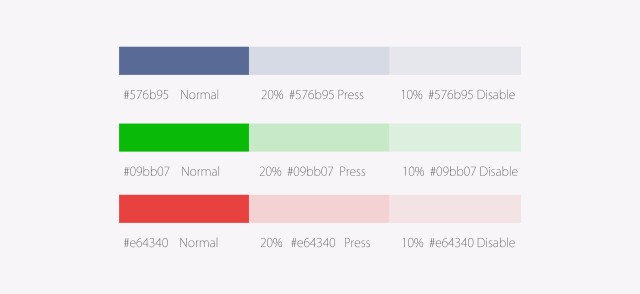 藍色為鏈接用色,綠色為完成字樣色,紅色為出錯用色 Press與 Disable狀態(tài)分別降低透明度為20%與10%;