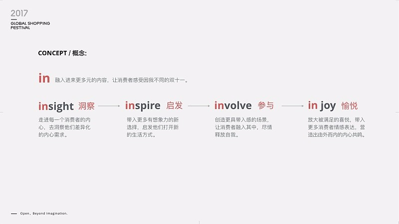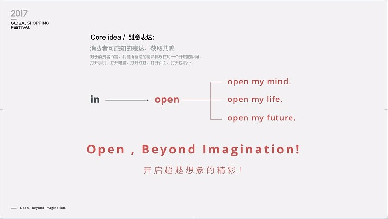 Open, Beyond Imagination! 開啟,超越想象的精彩!這就是我們表現(xiàn)上的靈感,用“open”來構(gòu)建情感上的共鳴。歷史再一次證明,想不出來,是因為買的還不夠!靈感襲來,設(shè)計師興奮的一夜沒合眼…
