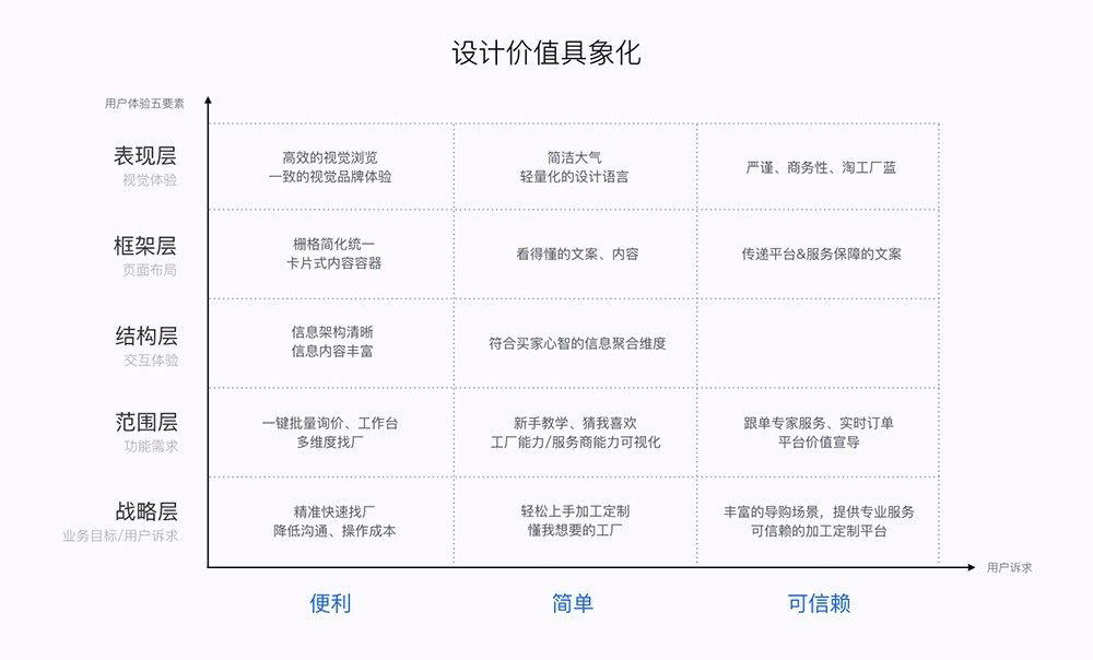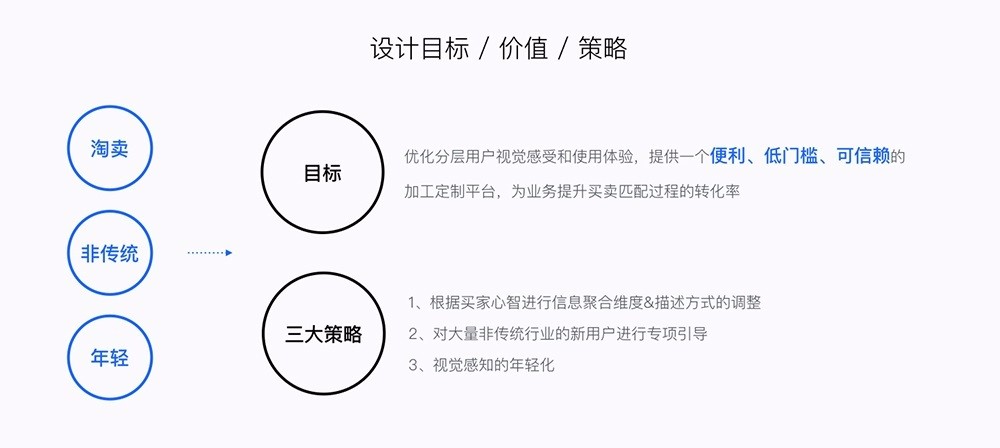 淘工廠的用戶大多是淘寶賣家,大部分的新興淘賣并非來自傳統(tǒng)行業(yè),他們更習(xí)慣于淘寶年輕化的視覺審美。然而,他們并不了解加工定制流程,也無法區(qū)分針織梭織毛織的工藝,更別說“大流水”、“小流水”這種專業(yè)的加工定制術(shù)語了。結(jié)合業(yè)務(wù)目標(biāo)與用戶目標(biāo),我們可以得出這次產(chǎn)品優(yōu)化的設(shè)計(jì)目標(biāo)與對應(yīng)的三大解決策略。