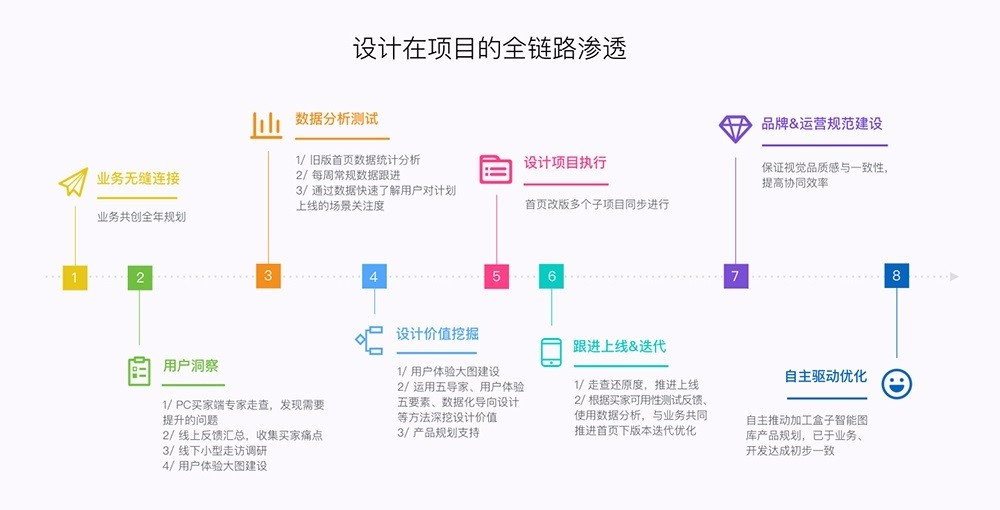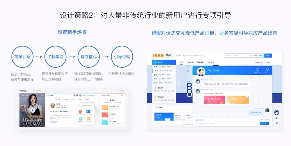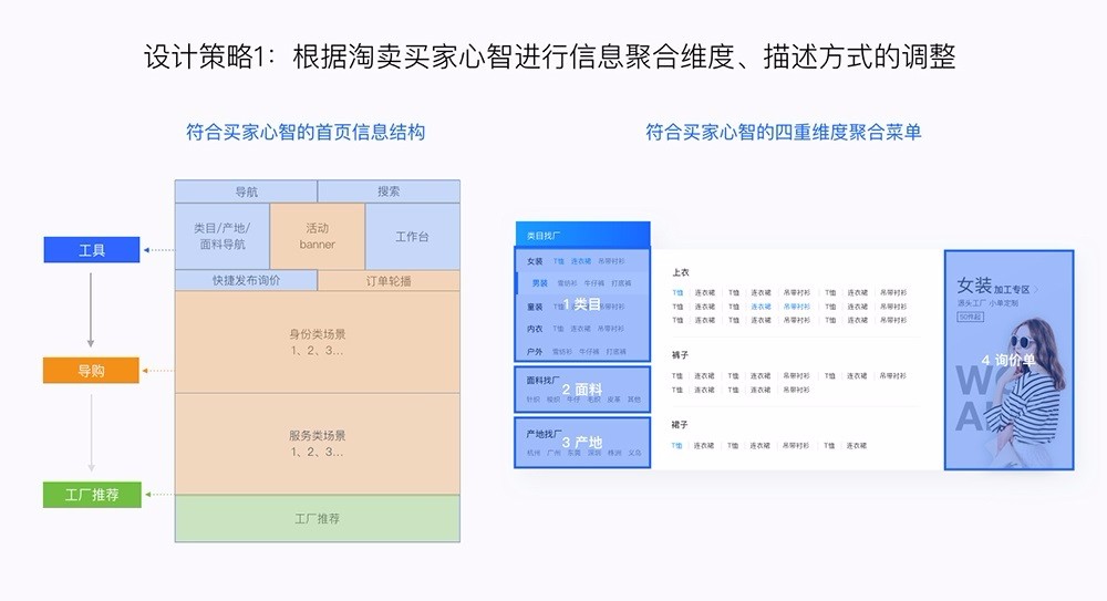 例如在淘工廠改版項(xiàng)目中,我跳出單一的視覺視角,通過運(yùn)用交互、產(chǎn)品、視覺等多手段來制定設(shè)計(jì)策略,靈活解決問題才是最關(guān)鍵的。