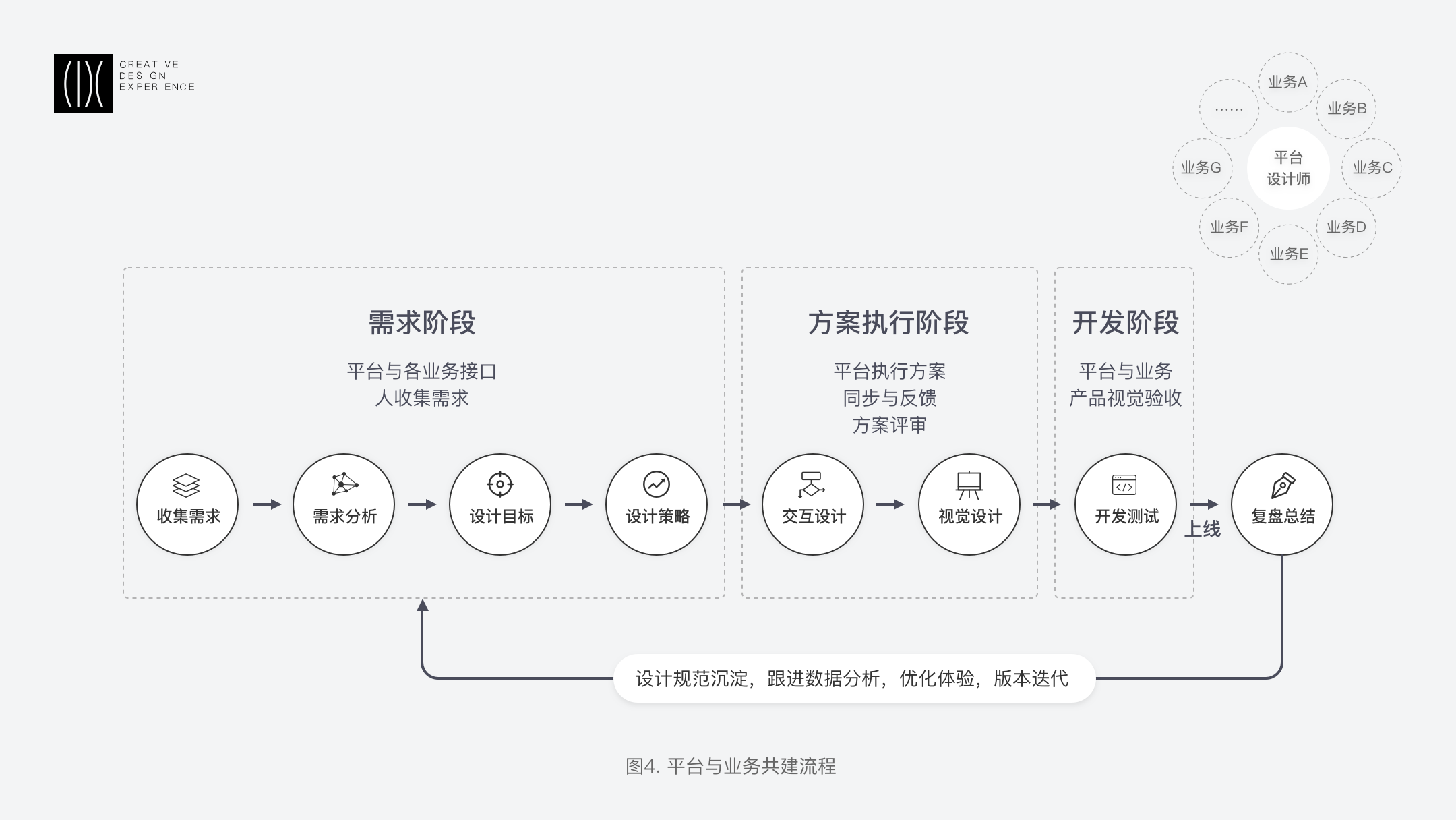 滴滴出行是涵蓋出租車、專車、快車等多項(xiàng)業(yè)務(wù)在內(nèi)的一站式出行平臺(tái),我們希望在保證全平臺(tái)統(tǒng)一化的基礎(chǔ)上,與業(yè)務(wù)尋求一種相輔相成的關(guān)系,并且在保證規(guī)范化輸出的同時(shí),展現(xiàn)出業(yè)務(wù)特色。在需求階段,確定各業(yè)務(wù)接口人,收集需求,溝通評(píng)審促成各方達(dá)成一致目標(biāo)。在方案執(zhí)行階段,平臺(tái)設(shè)計(jì)師產(chǎn)出方案,與各業(yè)務(wù)線溝通并優(yōu)化,1~2次循環(huán)后方案評(píng)審到最終確立。開發(fā)和測(cè)試階段,各方驗(yàn)收通過后發(fā)版上線,上線后平臺(tái)沉淀設(shè)計(jì)規(guī)范,完善組件庫(kù),跟蹤反饋,推動(dòng)體驗(yàn)優(yōu)化形成工作流程閉環(huán)。
