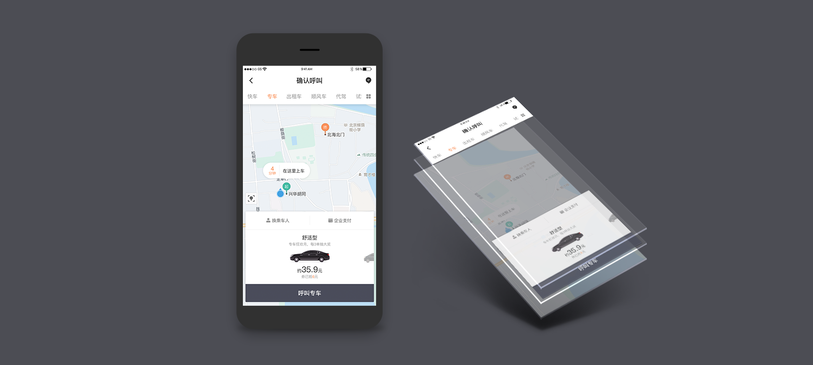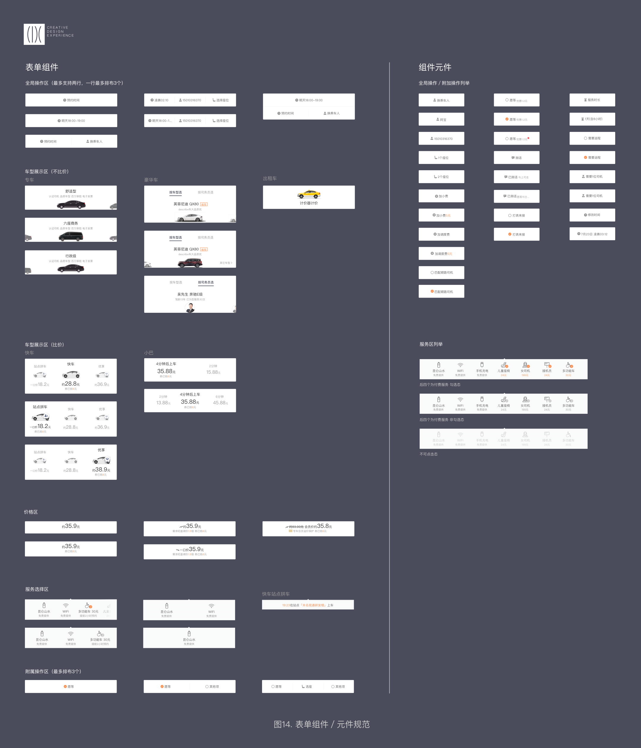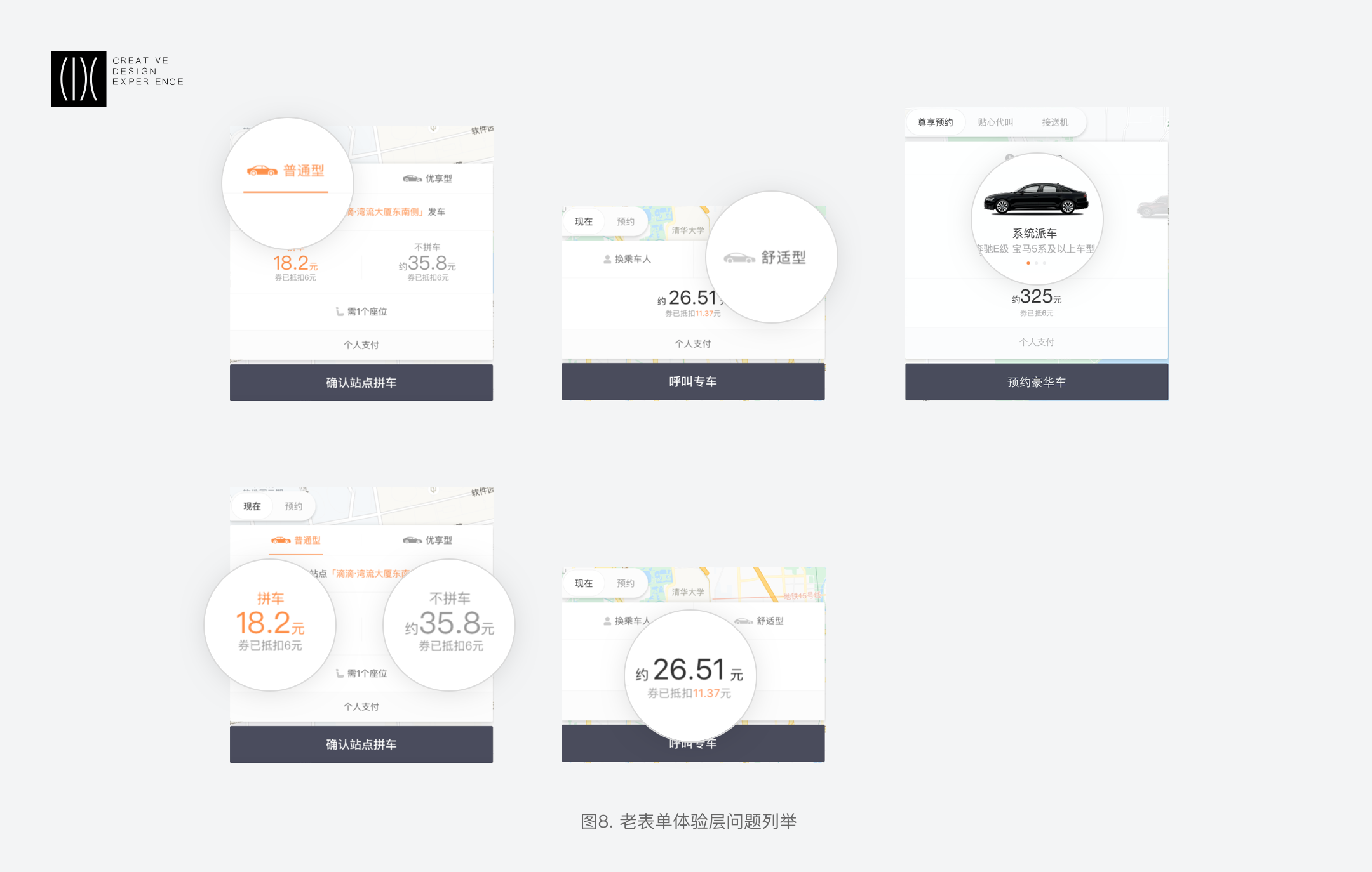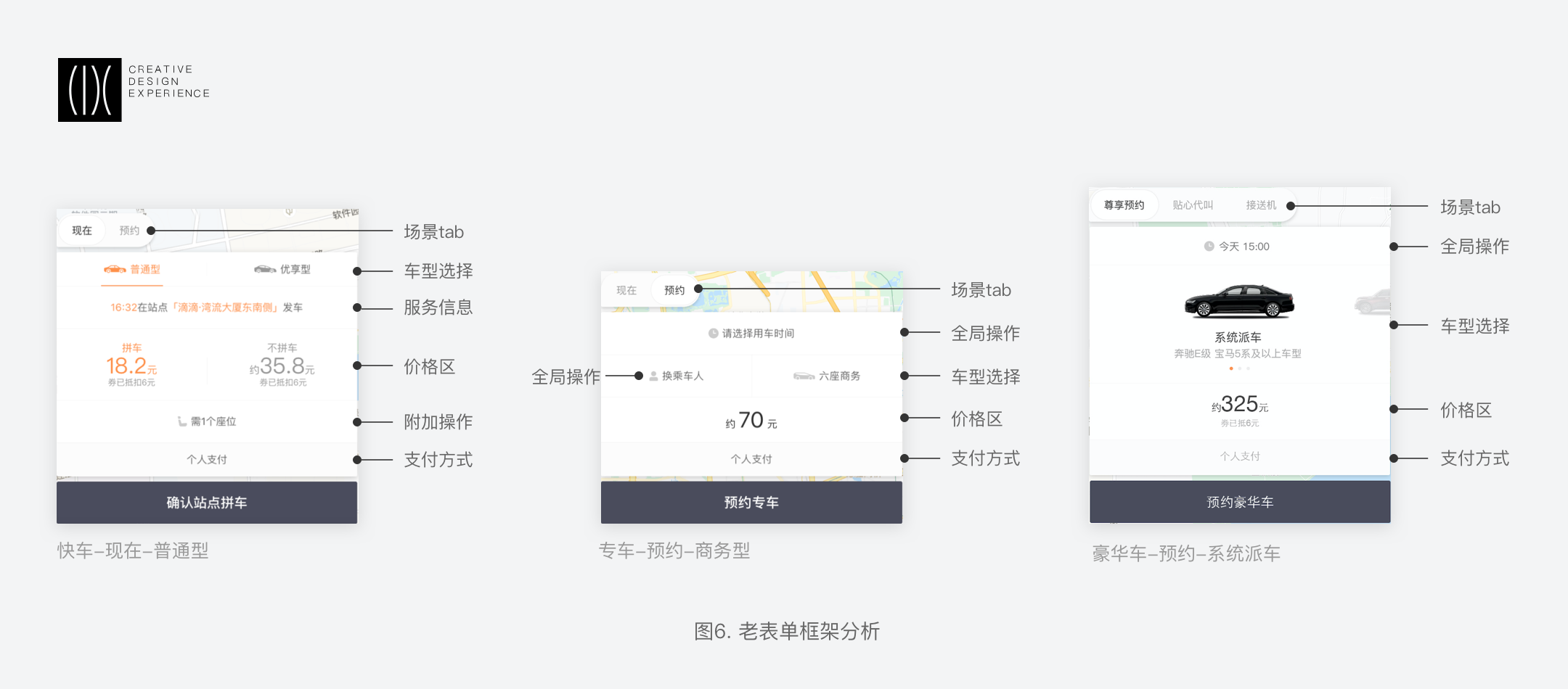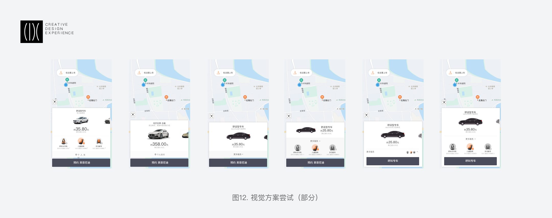 在差異中尋找共性:車型與價(jià)格區(qū)所包含的服務(wù)選擇與附屬操作是業(yè)務(wù)差異部分,快車需要在一個(gè)卡片中呈現(xiàn)三個(gè)車型比價(jià)、需要有附屬操作,專豪則需要強(qiáng)調(diào)車型圖片的露出和服務(wù)配置。我們要找一個(gè)平衡去把這些差異點(diǎn)串聯(lián)起來,確保用戶擁有同樣的感受,不僅是交互方式、動(dòng)效流轉(zhuǎn),也需要關(guān)注同一層級(jí)信息的視覺表達(dá)。