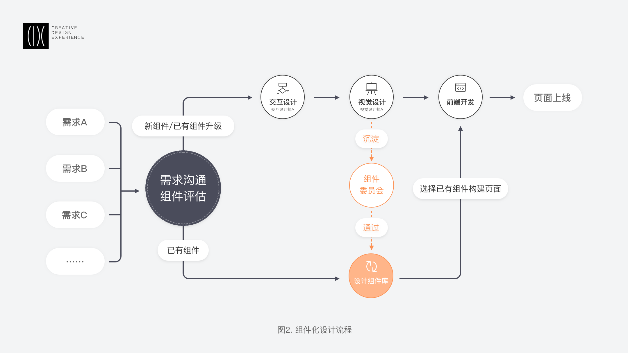 而將組件化思維貫穿其中的設(shè)計(jì)流程,帶來了工作流程上的創(chuàng)新。我們建立了一套設(shè)計(jì)組件庫(kù)來提高協(xié)同效率,大量需求均通過需求評(píng)估來判斷是否需要新增或復(fù)用組件,對(duì)于組件庫(kù)里已有的組件,設(shè)計(jì)師可直接調(diào)取,組合構(gòu)建出新頁(yè)面。對(duì)于新增組件則經(jīng)過常規(guī)設(shè)計(jì)流程后,歸納沉淀并由組件委員會(huì)審核通過后方可入庫(kù),以提升后續(xù)組件擴(kuò)展能力,助力產(chǎn)品快速更新迭代。