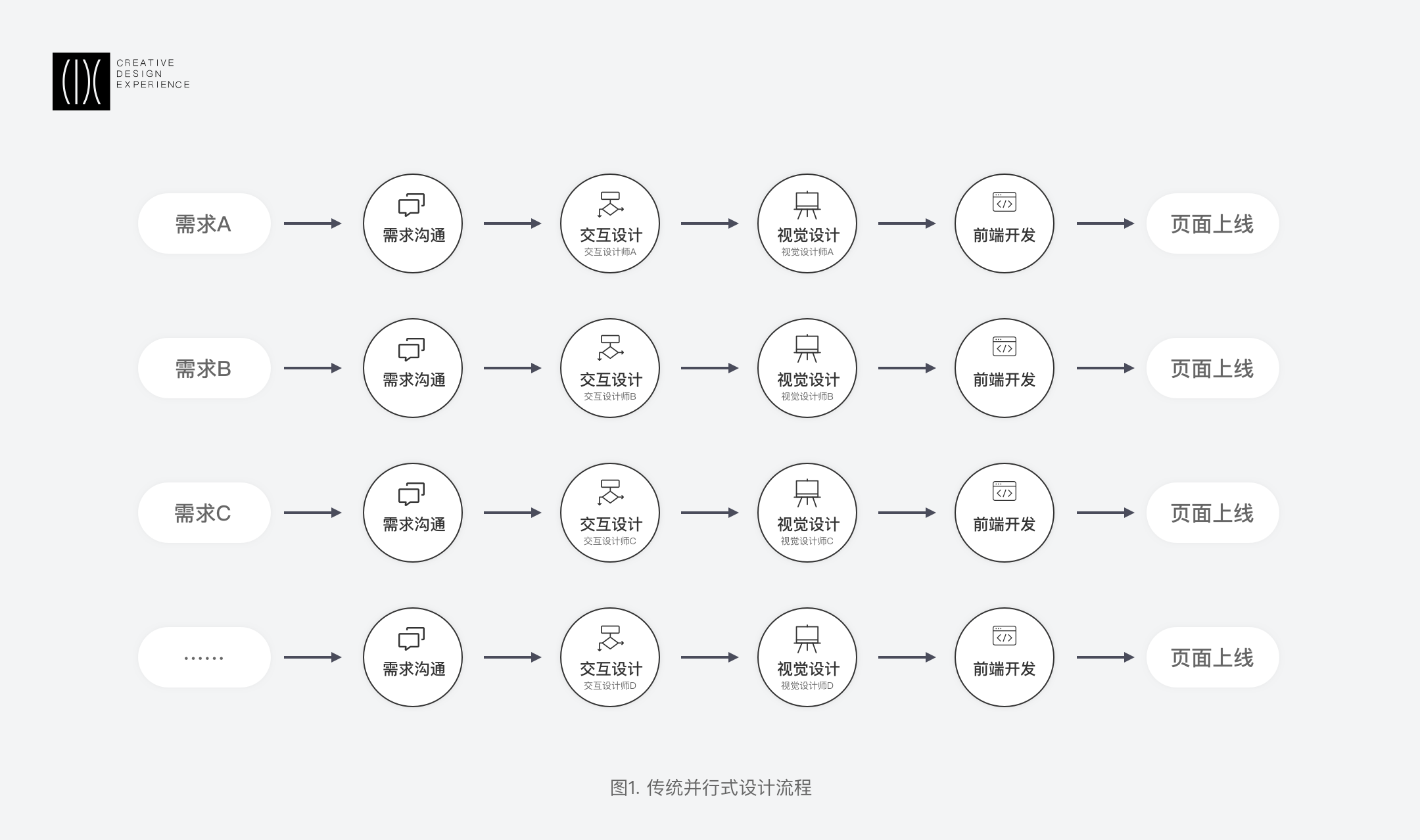 傳統(tǒng)的設(shè)計(jì)流程大多是同屬性多角色并行的,從需求到設(shè)計(jì),從設(shè)計(jì)到前端的工作流程會(huì)涉及到不同的設(shè)計(jì)師及不同的前端工程師。相同角色間無交集、缺乏溝通會(huì)導(dǎo)致大量重復(fù)性工作,增加項(xiàng)目周期和管理難度。