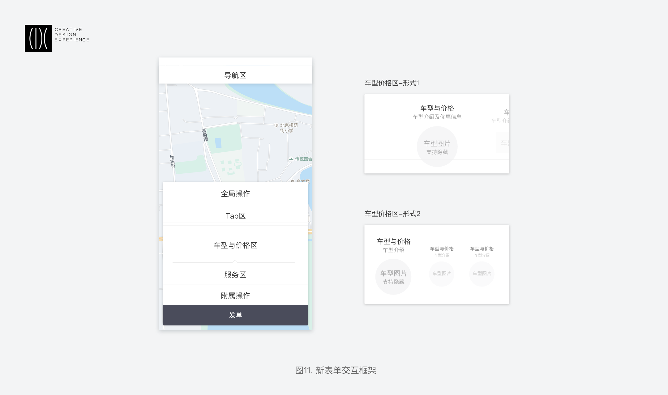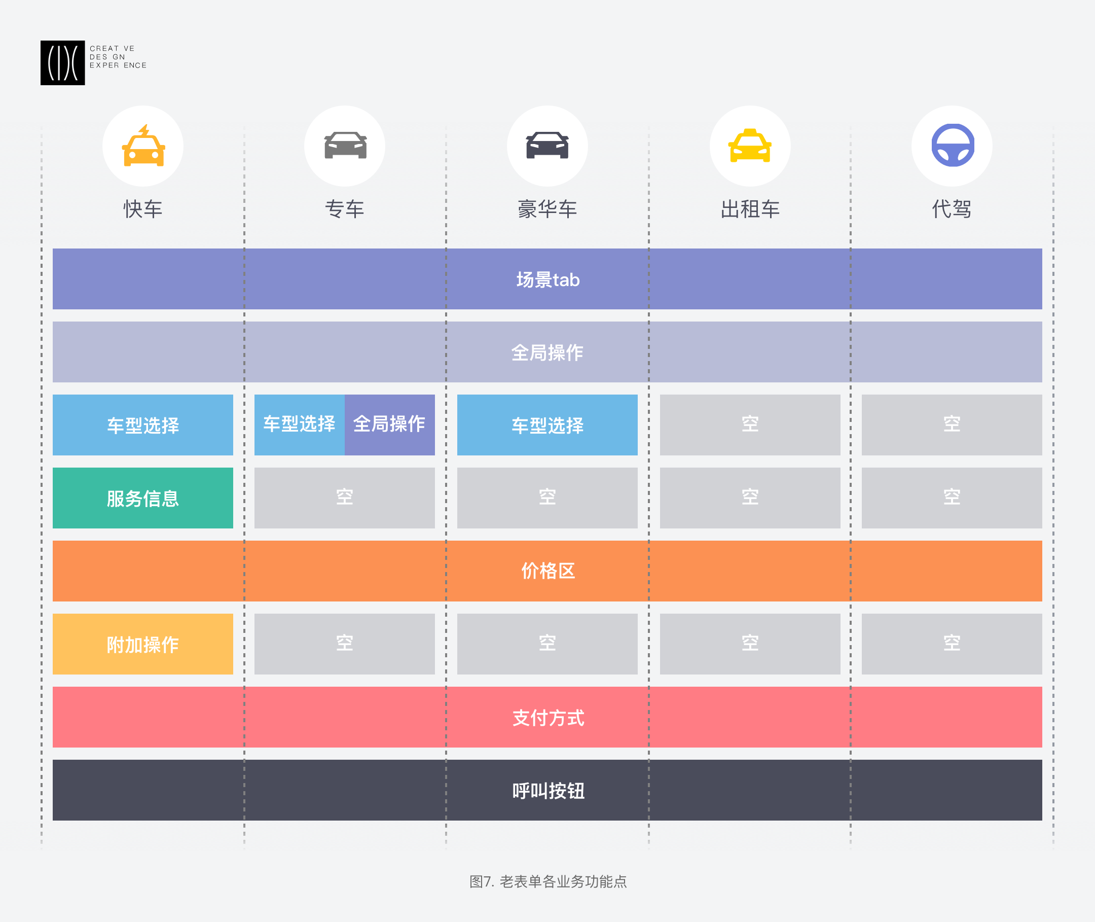 在共性中尋找差異性:全局操作、車型與價(jià)格、發(fā)單按鈕是業(yè)務(wù)共性部分,除車型/價(jià)格區(qū)和發(fā)單按鈕外,其余均可顯示或隱藏,可根據(jù)業(yè)務(wù)特點(diǎn)靈活配置。