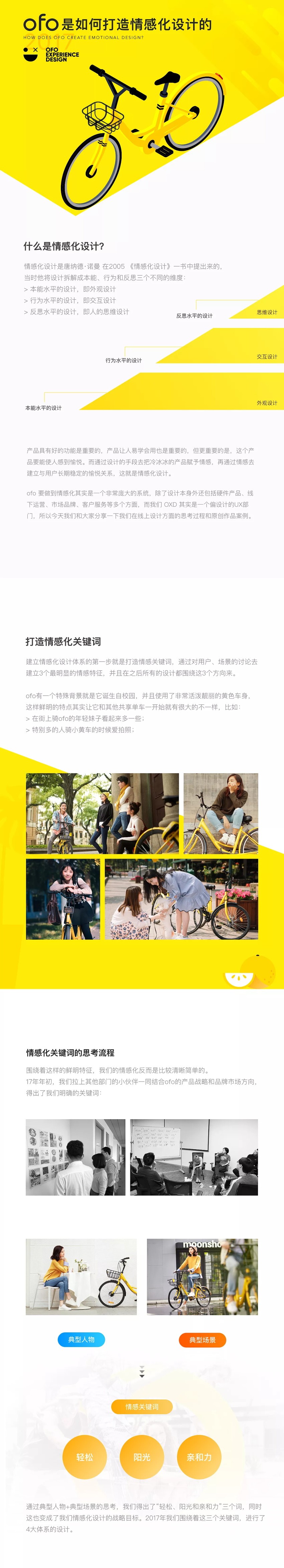 而實際上ofo除了是一個開鎖工具和代步自行車外和用戶的現(xiàn)實生活也存在在很多關(guān)聯(lián)性,用戶騎車小黃車上下班出勤、和朋友愛人家人一起逛街或周末出游。ofo 對他們來說除了騎行外,也是連接情感和美好生活的一款工具。于是因為這樣的關(guān)系和眾多場景,讓我萌生出了在ofo上嘗試情感化設(shè)計的想法。