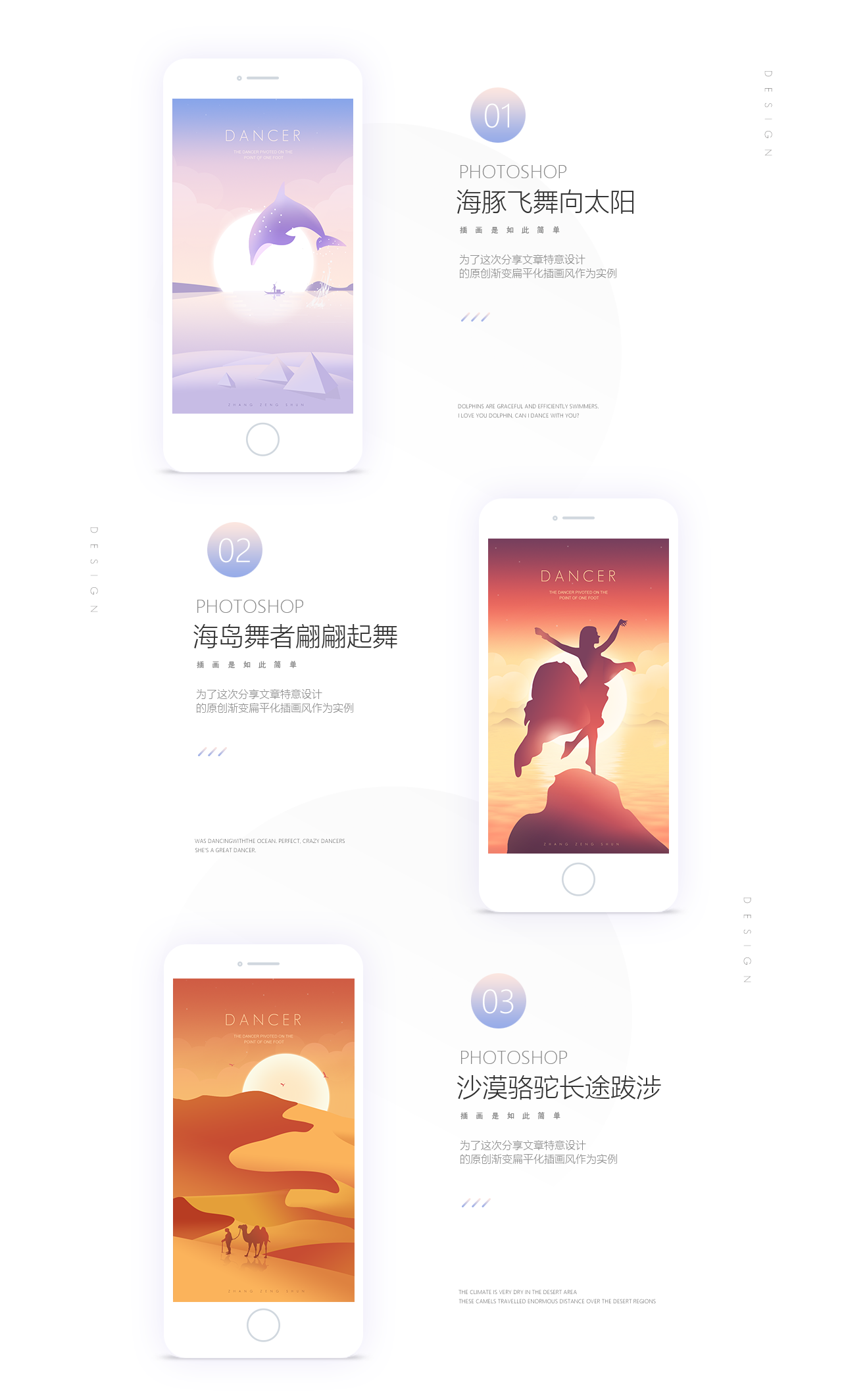 今天帶給大家一個教程,如何用PS+AI快速實現(xiàn)扁平化插畫風(fēng),這個教程應(yīng)該在去年的時候就應(yīng)該分享給大家,因為工作比較忙這個事就擱淺了,還好現(xiàn)在去做這個教程還不算晚,畢竟這個風(fēng)格一直現(xiàn)在延續(xù)。為了寫這一篇文章教程,自己設(shè)計了三張扁平化插畫風(fēng)海報,根據(jù)照片來源靈感,結(jié)合流行漸變色進(jìn)行創(chuàng)意組合設(shè)計。以下為實例的教程,不只是步驟上教大家如何去完成,其實更多是一些在設(shè)計過程中的一些思考。分享的教程頁面可能會很長,為了讓大家更好的理解步驟介紹的相對比較詳細(xì),其實大致總結(jié)起來也就幾個步驟快速的完成。