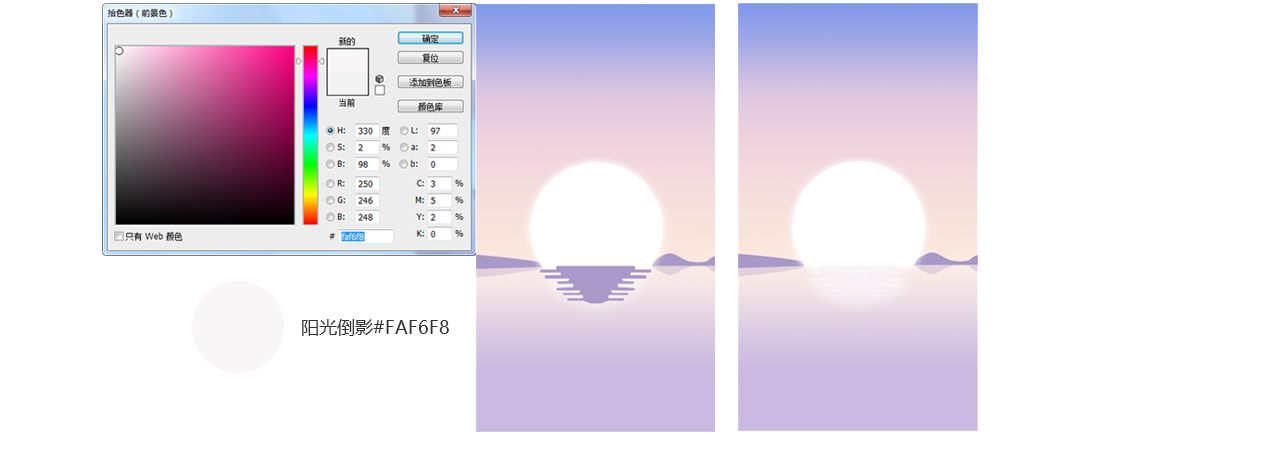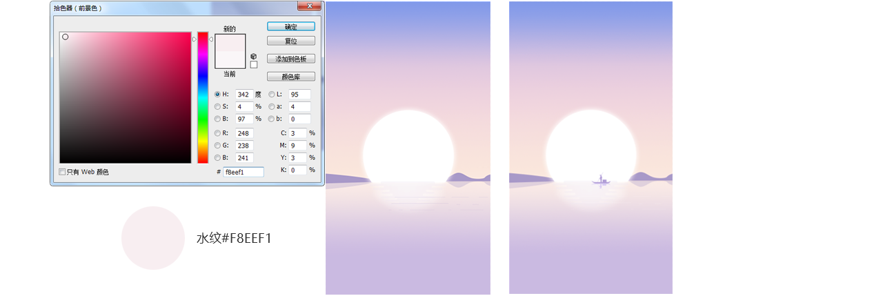 7.湖面陽光倒影處理使陽光及湖面更真實做進(jìn)一步的細(xì)化。在AI中繪制這樣的圖形,然后拖拽到PS中。給圖形一個顏色,讓圖形融合水面顏色值#faf6f8