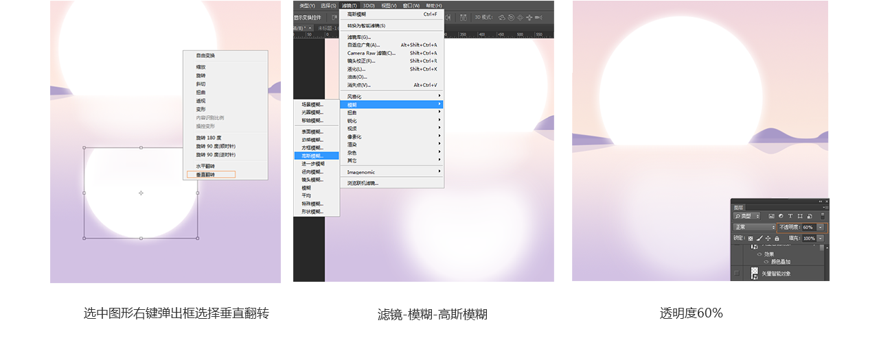 6.湖面處理在底色上復(fù)制一個太陽縮小一點(diǎn)太陽,垂直旋轉(zhuǎn)作為投影。濾鏡-模糊-高斯模糊,然后給投影一個透明度60%