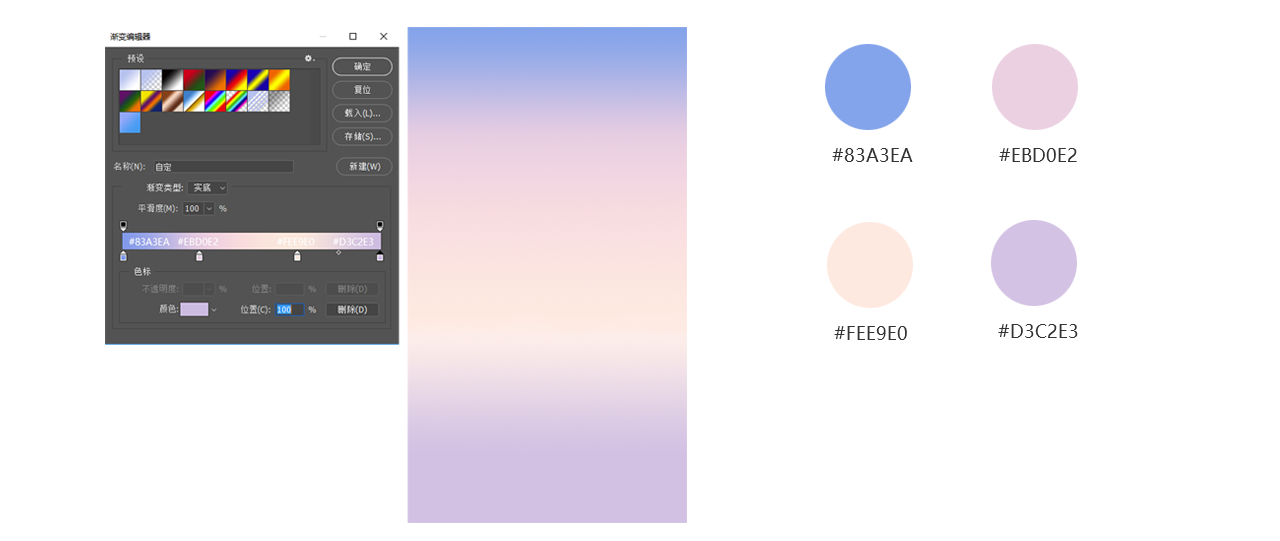 2在畫布上給畫面一個背景顏色,背景顏色在前期構(gòu)想中就要有個想法,大致要什么樣的顏色。漸變色填充整個背景,背景色彩會主導(dǎo)整個畫面顏色方向漸變數(shù)值為: