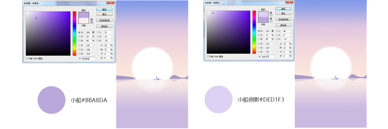 9.湖面也處理差不多了、那么給整個畫面增加一些輔助氣氛、在AI中畫的小船漁夫?qū)氲疆嬅嬷校瑪[放好位置,給小船一個顏色#bba8da,這樣小船感覺像在空中飄著,緊接著給小船一個陰影讓小船有一個厚重感是在海面上飄著的。復(fù)制一層小船,然后旋轉(zhuǎn)把小船壓扁一些感覺像個倒影、給小船陰影一個顏色#ded1f3。