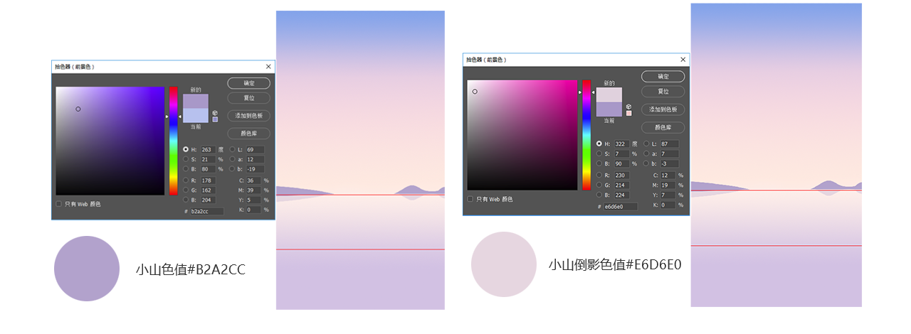 4繪制小山可在PS中或者AI中繪制,哪個方便就用哪個,沒有特意要求,把小山放在天水分割線處,給小山顏色#b2a2cc 然后復(fù)制出一層小山作為倒影,顏色#e6d6e0