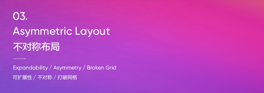 與過去基于固定網(wǎng)格系統(tǒng)的布局相比,最近越來越趨于使用僅顯示圖像一部分的非對稱布局。雖然好像只顯示整個圖像的一部分,設(shè)計師卻可以在大系統(tǒng)中無限延展每個圖形。你可以認(rèn)為平衡被打破了,設(shè)計師卻可以更加自由地應(yīng)用圖形元素,呈現(xiàn)更強烈的視覺印象,還可以有很酷的圖形組成。
