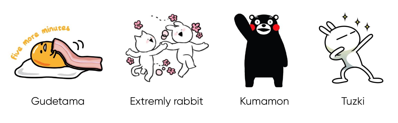1) There are many characters in unique hand drawing style. 2) Many characters are from games and animations. 3) Characters are used in various field of industries such as local governments and transportation cards.