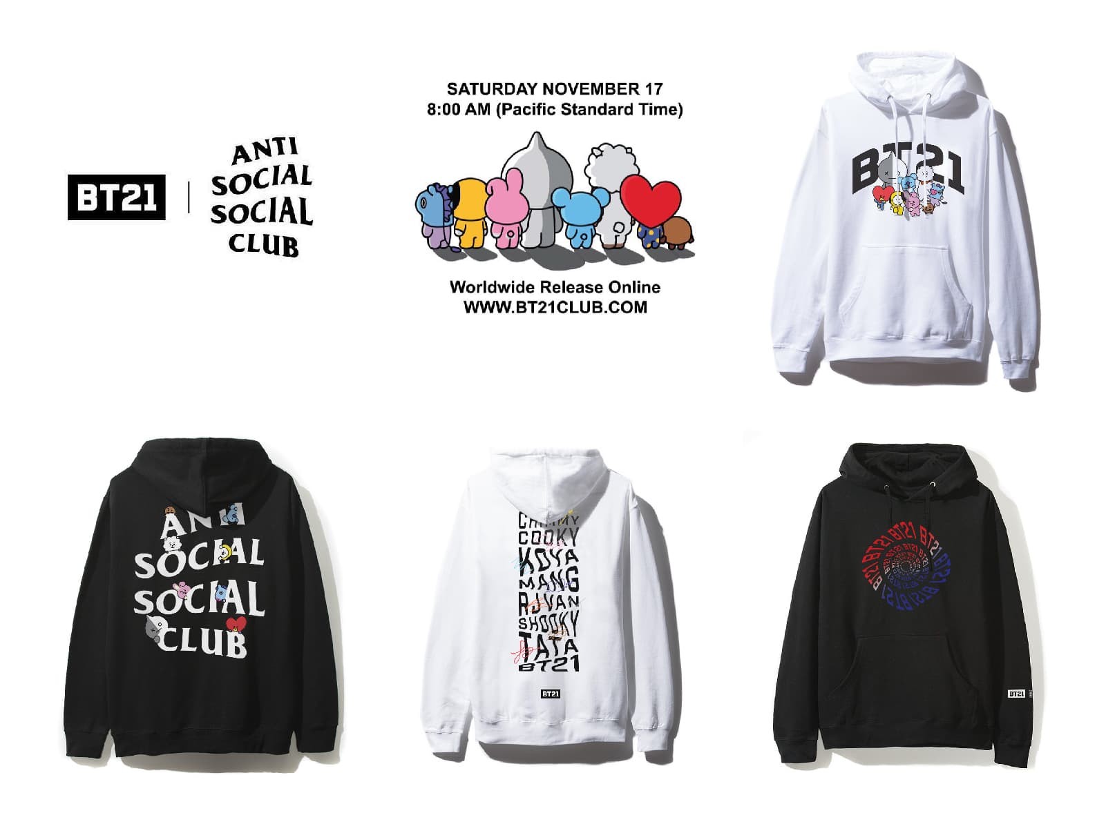 Anti Socal Social Club曾經將他們靈活的logo應用在各式短語或品牌名稱中。這次聯(lián)名,他們把標志性的logo與BT21的角色,品牌名稱還有缺乏萌性、略顯笨拙的logo相融合,很好地協(xié)調了ASSC獨特的品牌風格。