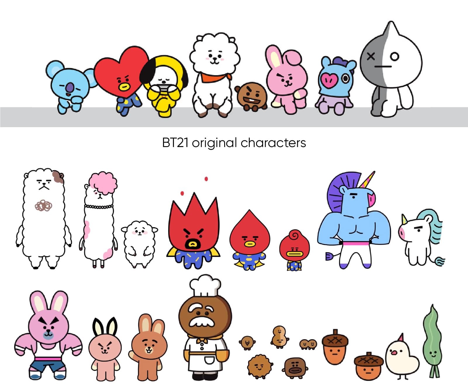 為BT21新設計的各種人物,傳達了BT21親朋好友的設計理念。這些不同的角色版本也受到BTS粉絲的喜愛。