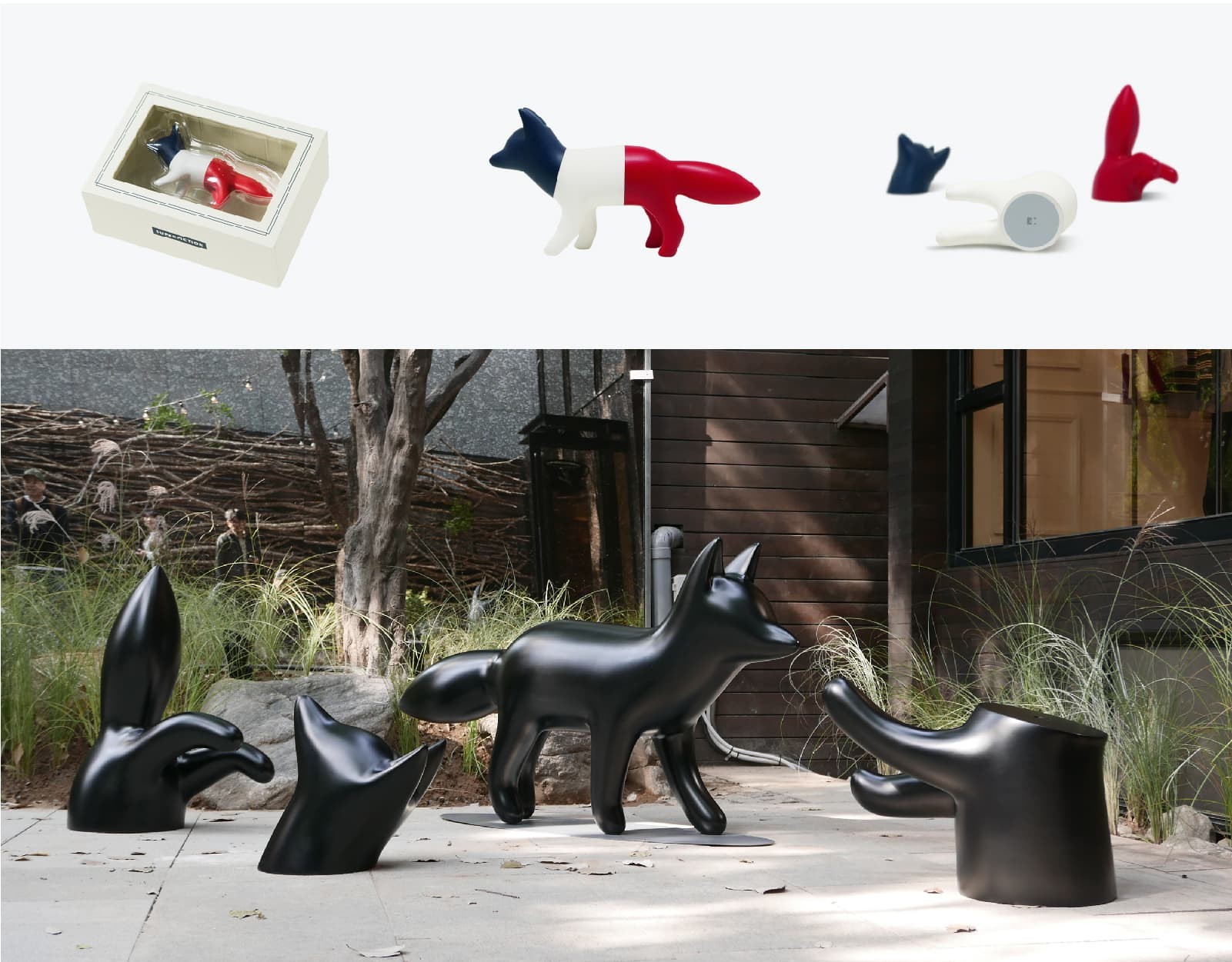這是Super Fiction和全球時尚品牌Maison Kitsune的合作項目。他們設計了一個玩具形象,以此反映Maison Kitsun的狐貍特征。這只具有狐貍形象的大雕塑正在韓國第一家Maison Kitsune的商店門前展出。