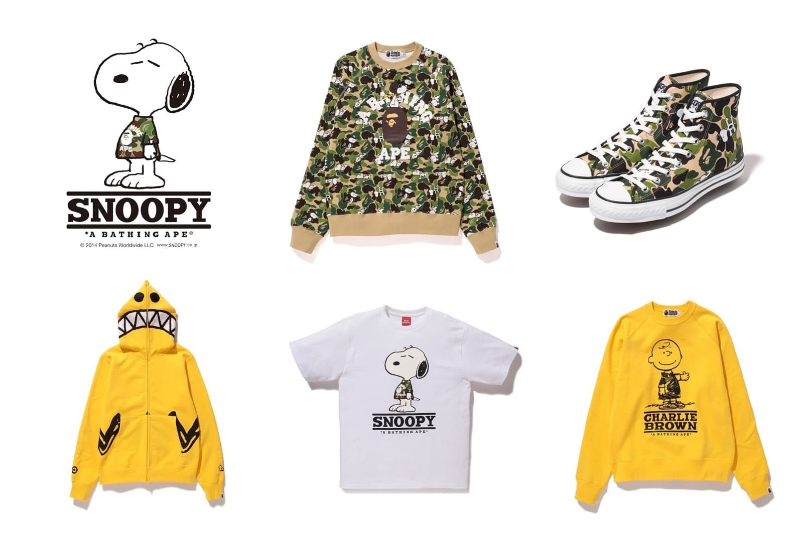 以大猩猩logo和圖案而聞名的街頭時尚品牌Bape,和史努比合作慶祝它的20周年。 Bape將其獨特的迷彩圖案與史努比角色一起應用于各種各樣的產品中。