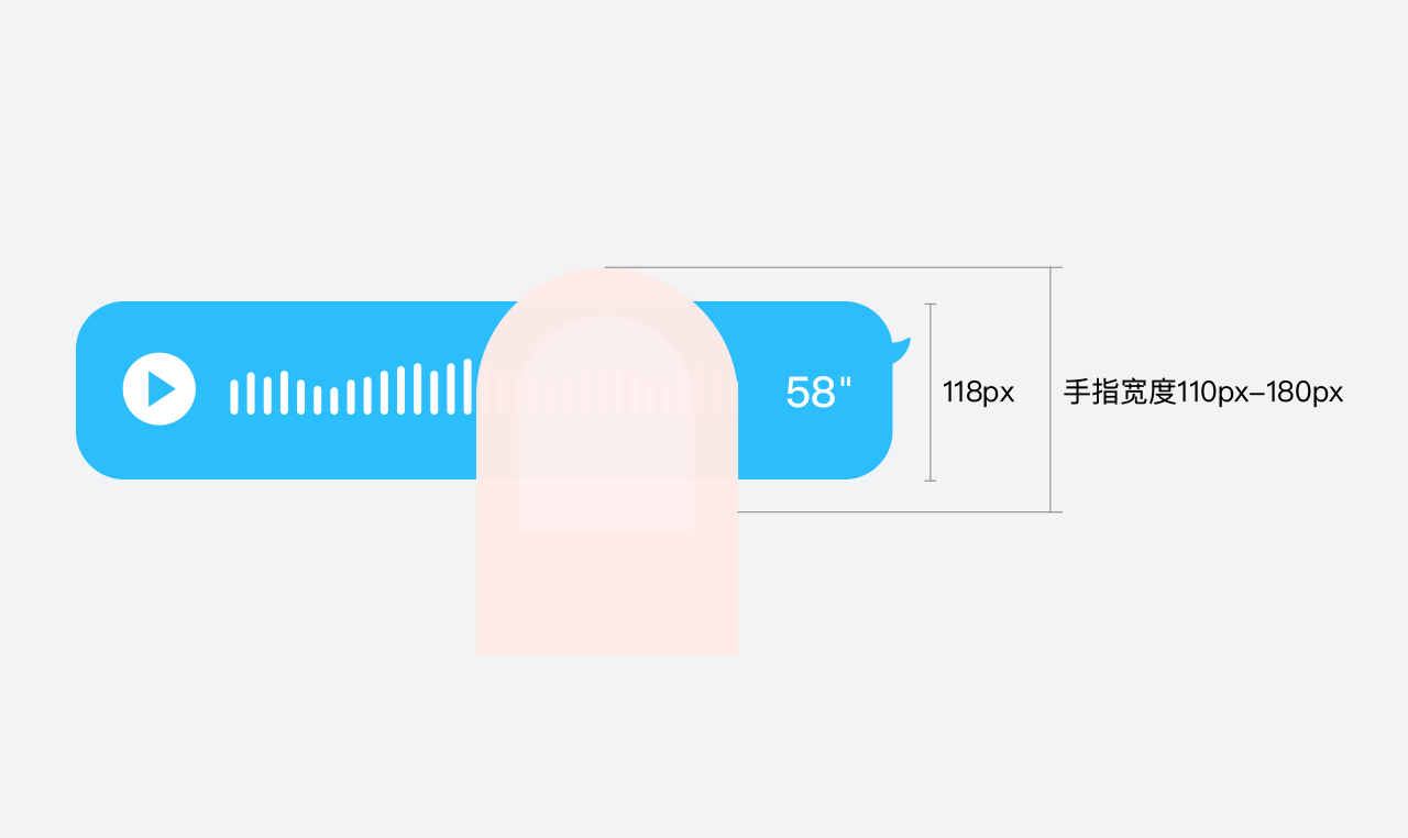 暢快意味著無拘無束,翻譯成交互語言就是要賦予用戶更大的操作區(qū)域。但是我們的手指寬度和控件大小有時難以匹配。例如,8.0UI改版后的語音氣泡高度為118px,而成人手指的寬度范圍則在110px-180px。如果拖拽只能在氣泡范圍內(nèi)進(jìn)行,就意味著用戶需小心翼翼地去操作。為了實(shí)現(xiàn)“無拘無束”的拖拽體驗,我們根據(jù)用戶的行為階段對響應(yīng)范圍進(jìn)行了兩次放大。