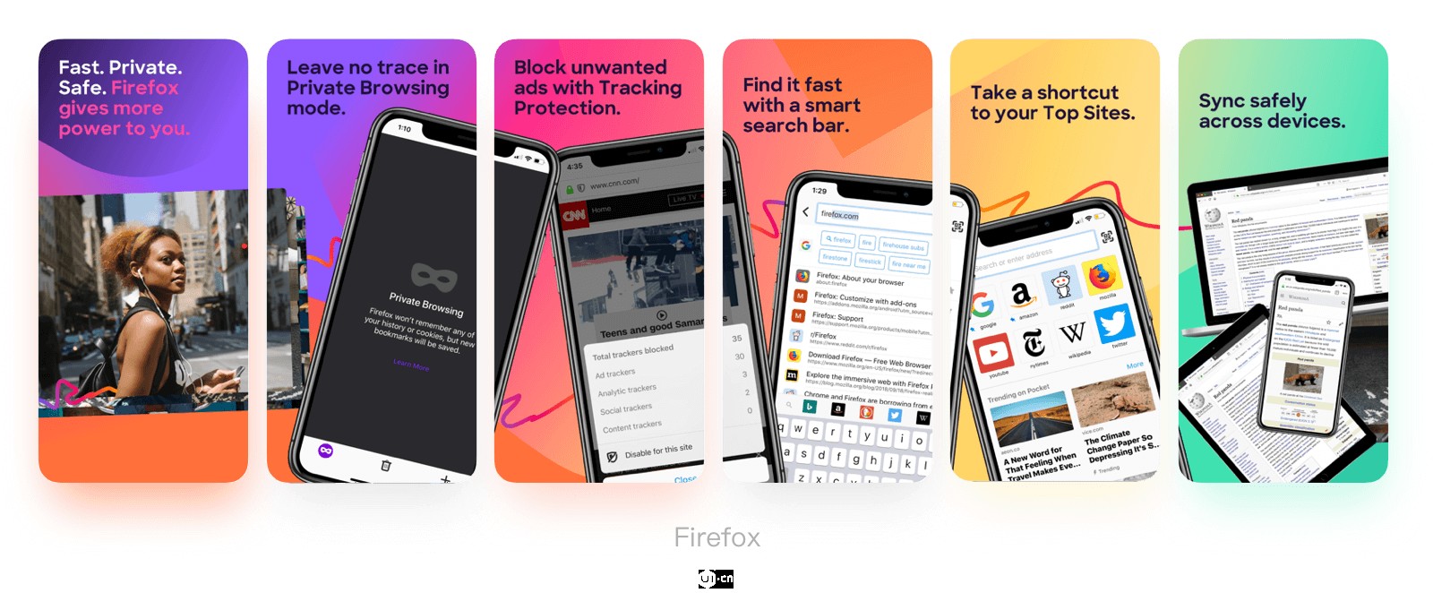 比如Mimo,同樣是截圖+文案+手機(jī)框的元素,但因?yàn)檎{(diào)整了手機(jī)的位置,上下穿插的變化讓畫(huà)面更加活潑。Firefox讓手機(jī)的連續(xù)跨屏結(jié)合背景的色彩漸變,使界面更加活力時(shí)尚。
