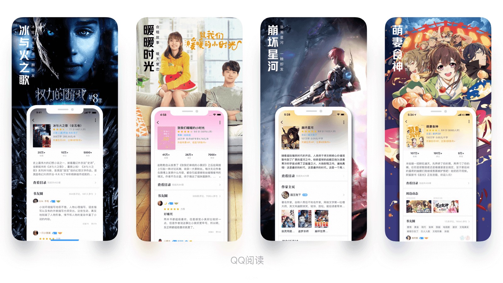 展示產(chǎn)品的內(nèi)容,一般內(nèi)容平臺(tái)型產(chǎn)品如視頻、書(shū)籍、音頻類用的比較多,產(chǎn)品的內(nèi)容資源豐富,更新較快時(shí)效性較強(qiáng)、經(jīng)常結(jié)合當(dāng)下的熱點(diǎn)資源,以內(nèi)容吸引用戶。如下圖QQ閱讀的市場(chǎng)圖展示的就是當(dāng)前熱門書(shū)籍。