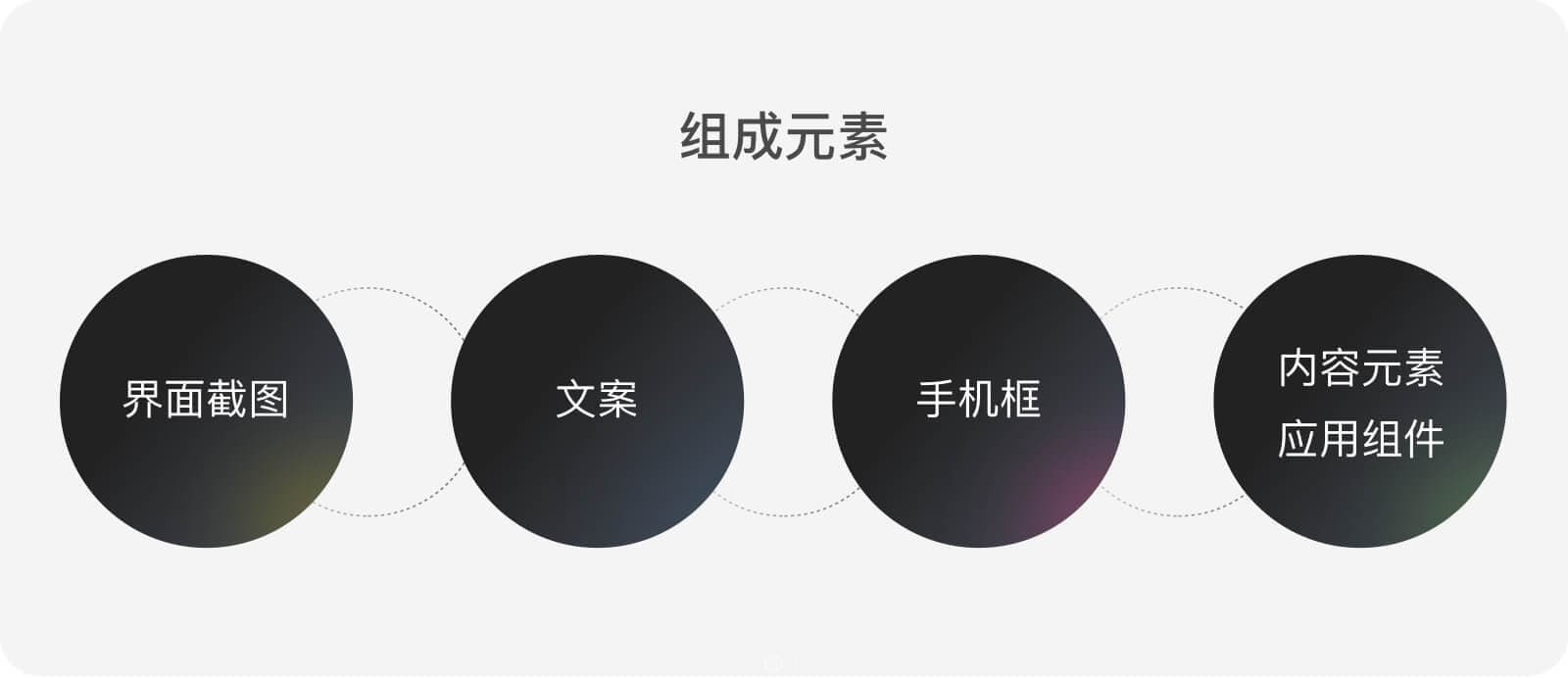 ·市場(chǎng)圖的組成元素主要有界面截圖、文案、手機(jī)框、內(nèi)容元素和應(yīng)用組件。