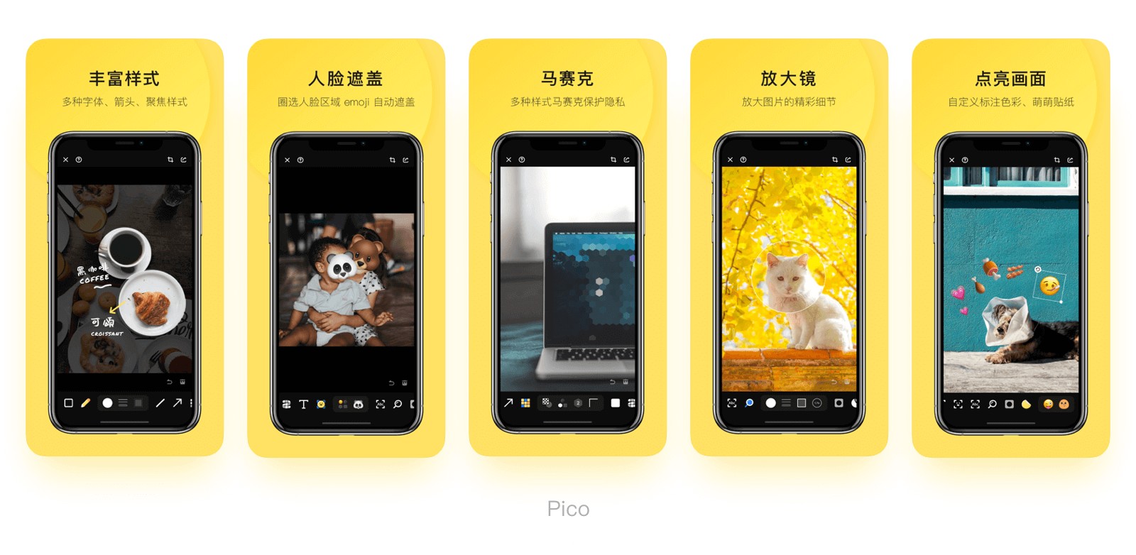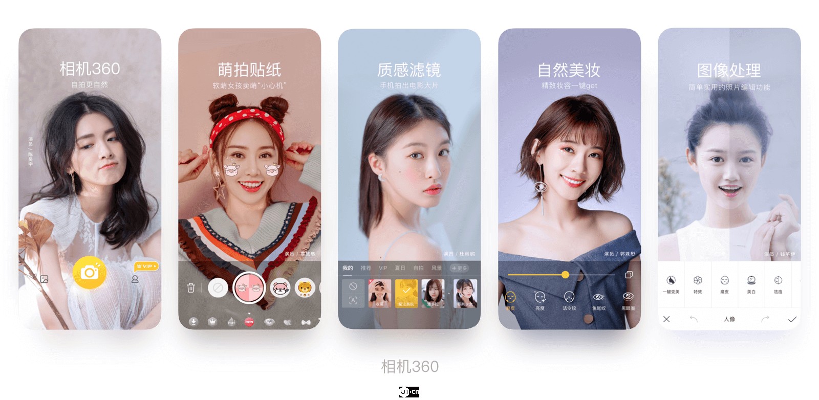展現(xiàn)產(chǎn)品的亮點(diǎn)、價(jià)值、核心功能或是本次更新改版的特性等,主要是讓用戶快速得到有價(jià)值的信息,了解產(chǎn)品的功能特性,區(qū)別于競(jìng)品。一般工具型產(chǎn)品都傾向于選擇這樣的內(nèi)容。如360相機(jī),5張圖分別展示了產(chǎn)品的5種功能。