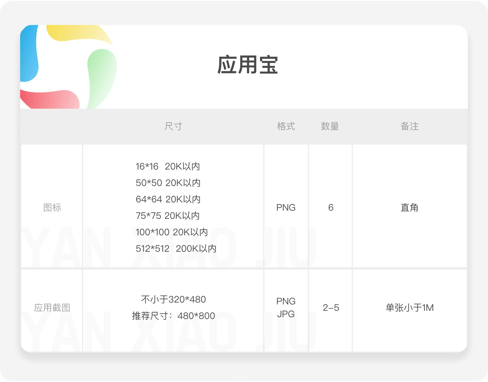 市場(chǎng)圖不同于頁(yè)面設(shè)計(jì),頁(yè)面我們需要考慮的是iOS、Android兩大系統(tǒng)的區(qū)別。而應(yīng)用圖因?yàn)槭窃诓煌脚_(tái)市場(chǎng)使用,每個(gè)平臺(tái)都有自己的規(guī)范,所以幾乎每個(gè)平臺(tái)都需要有一套單獨(dú)的圖,不過(guò)近兩年安卓各平臺(tái)間的差異化逐漸縮小,可以通用的尺寸正在增加。