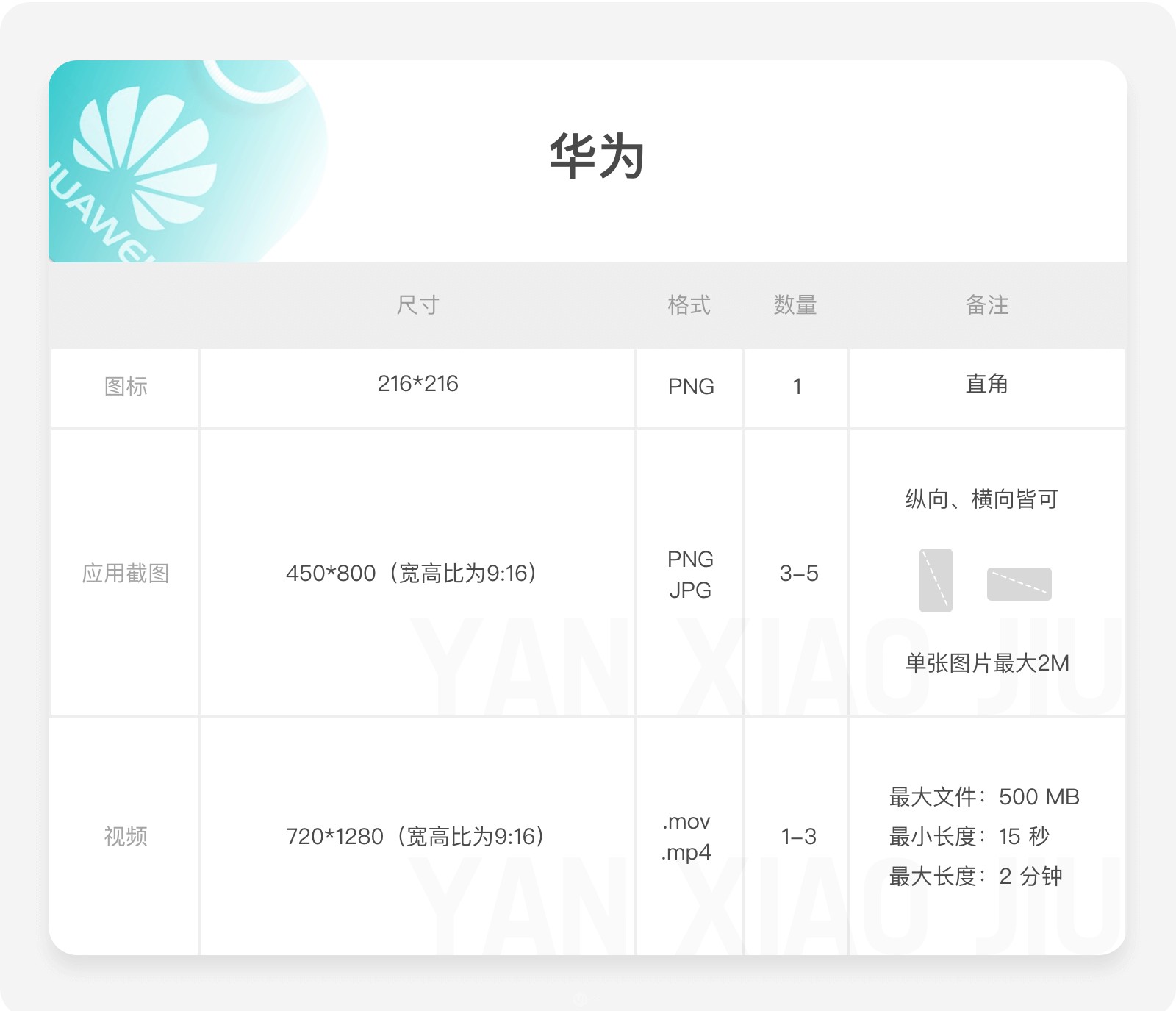 應(yīng)用截圖:最小 320 像素,最大 3840 像素,JPG/PNG 格式,圖片比例 2:1,至少需要4個(gè)圖片,最多可上傳8個(gè),需使用不帶品牌信息的手機(jī)。