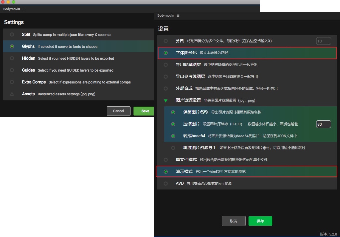 每次導(dǎo)出時都需要進(jìn)行設(shè)置。標(biāo)紅區(qū)域為必選選項。字體圖形化可以將字體轉(zhuǎn)化為路徑,不勾選會因為應(yīng)用的平臺沒有相應(yīng)字體導(dǎo)致文字加載出錯;勾選演示模式后會生成 html 文件,打開該文件即可預(yù)覽動效。
