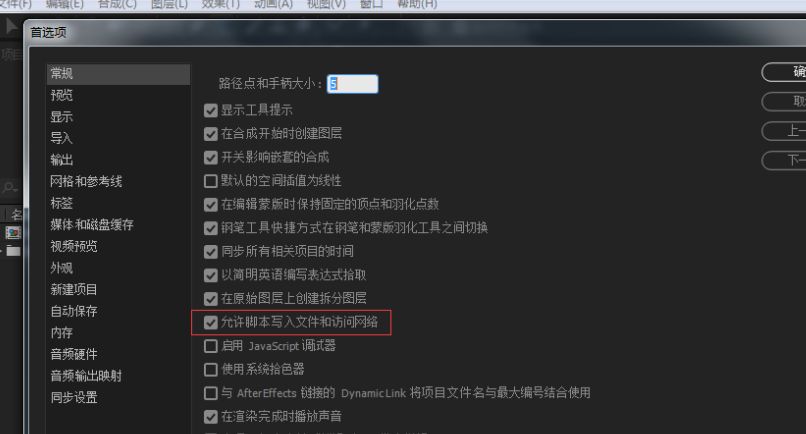Mac:轉(zhuǎn)到Adobe After Effects>首選項>常規(guī)>并選中「允許腳本寫入文件和訪問網(wǎng)絡(luò)」。