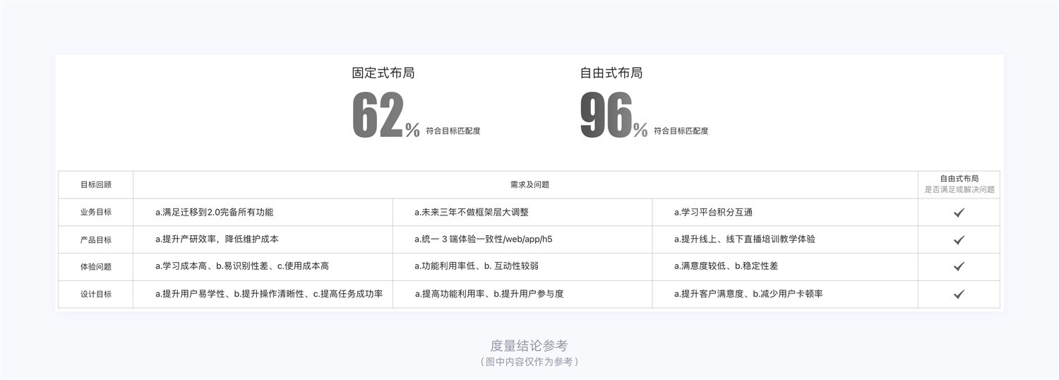 - 最后,我們還需要衡量新框架與目標(biāo)的匹配度。即使新的框架設(shè)計(jì)符合目標(biāo),并且可以解決一些可用性測(cè)試出來的體驗(yàn)問題,但我們還需要確保它與目標(biāo)完全匹配。換句話說,我們需要確保新的框架設(shè)計(jì)可以最大程度地滿足我們的目標(biāo),并且能夠帶來更好的用戶體驗(yàn)和產(chǎn)品滿意度。