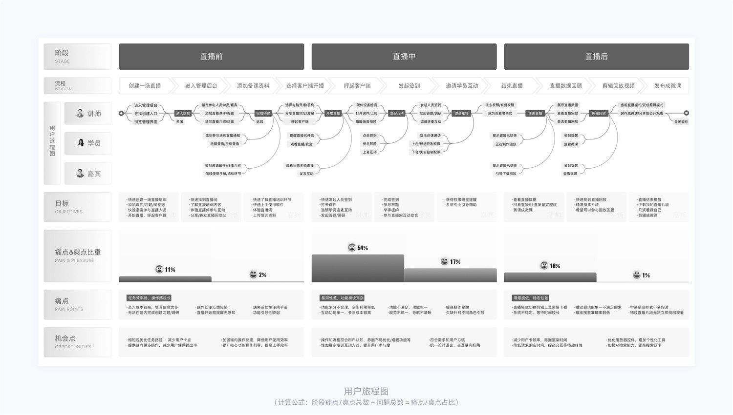 通過用戶訪談得出來數(shù)據(jù)結(jié)果,我們將采用繪制用戶旅程圖方式,可以更全面地了解用戶在使用產(chǎn)品或服務(wù)的過程中所經(jīng)歷的流程和步驟,以及用戶的觸點(diǎn)、行為、痛點(diǎn)、爽點(diǎn)以及內(nèi)心 OS 等元素。通過將用戶旅程圖與用戶訪談得出的數(shù)據(jù)進(jìn)行結(jié)合,我們可以更有效地識(shí)別出用戶在使用過程中問題暴露最多的環(huán)節(jié),從而針對(duì)性地優(yōu)化產(chǎn)品體驗(yàn)。