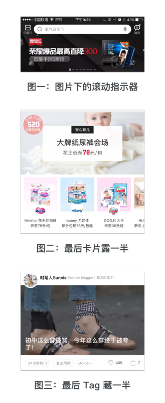 引導的方式有很多,最常見的三種做法分別是:左右加引導箭頭、底部加指示器、后續(xù)內容漏一部分。