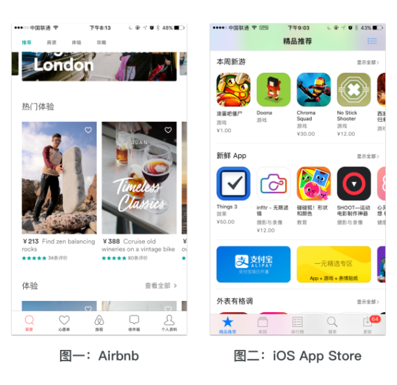 以最新版的 Airbnb 為例,它將首頁分割為 Banner、熱門體驗、體驗、房源、旅游目的地精選等多個維度,每個維度單獨占據一整行,并展現(xiàn)并列的內容。再看 iOS App Store,也是將頁面分為諸多維度,把不同的應用分類呈現(xiàn)。