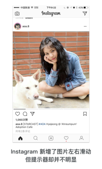 舉個反面例子,Instagram 不久前新增了圖片多張左右滑動的設計,但是我們發(fā)現(xiàn)它底部的指示器在頭上圖片非常搶眼的情況下非常不容易被發(fā)現(xiàn),指示效果并不好。