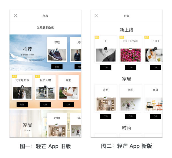 最近還常見到比較夸張的做法,是直接在泳道最左端給一個強內容氛圍。以下圖左側的輕芒閱讀 App 舊版頁面為例,圖片+文字氛圍的做法雖然極大強調了主題,但卻也極大浪費了展現(xiàn)效率,違背了內容優(yōu)先的原則,效果并不好。