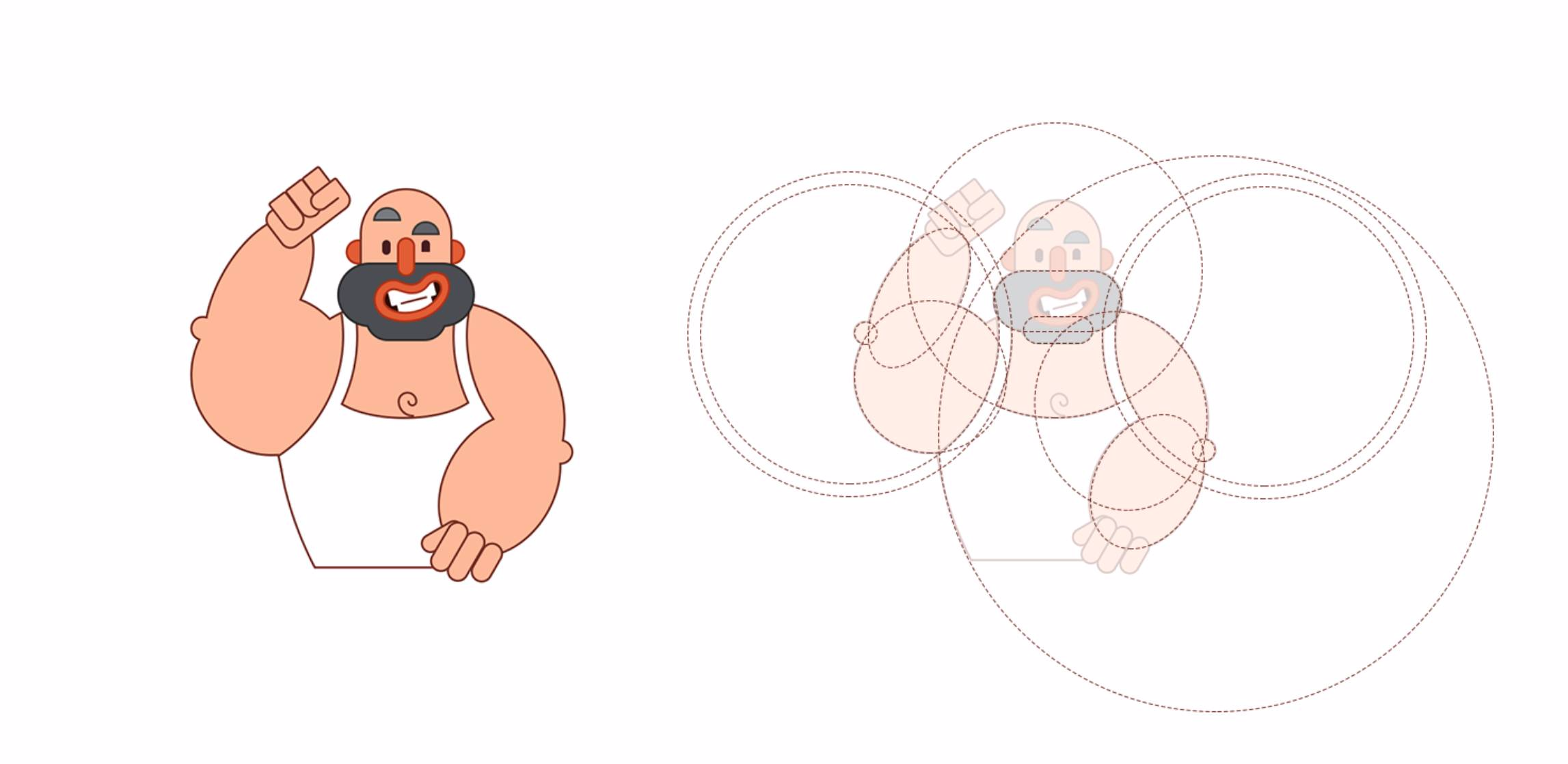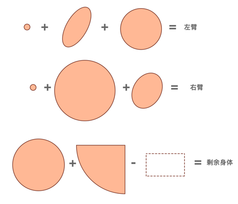 以稍微復雜一些的身體為例,它其實是由很多的圓形,橢圓形疊加而成。